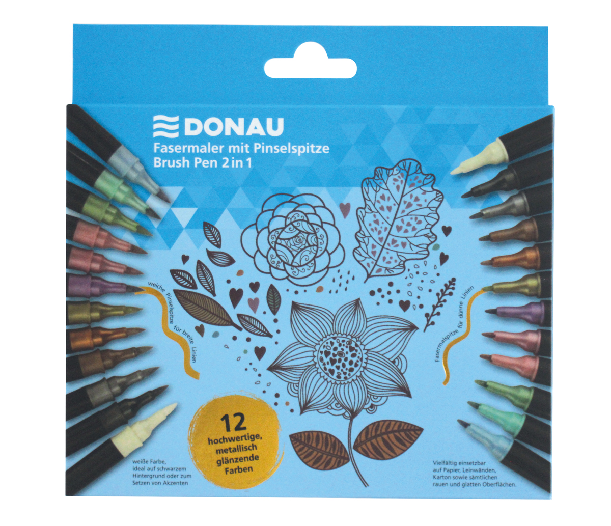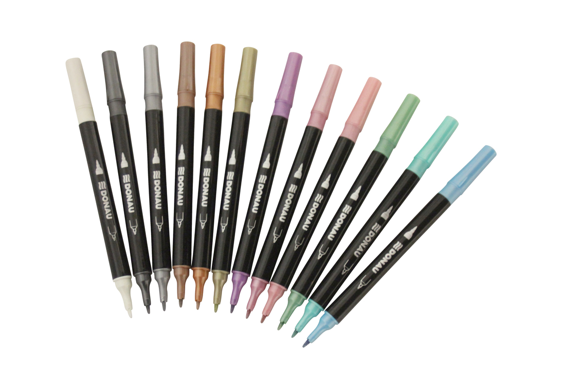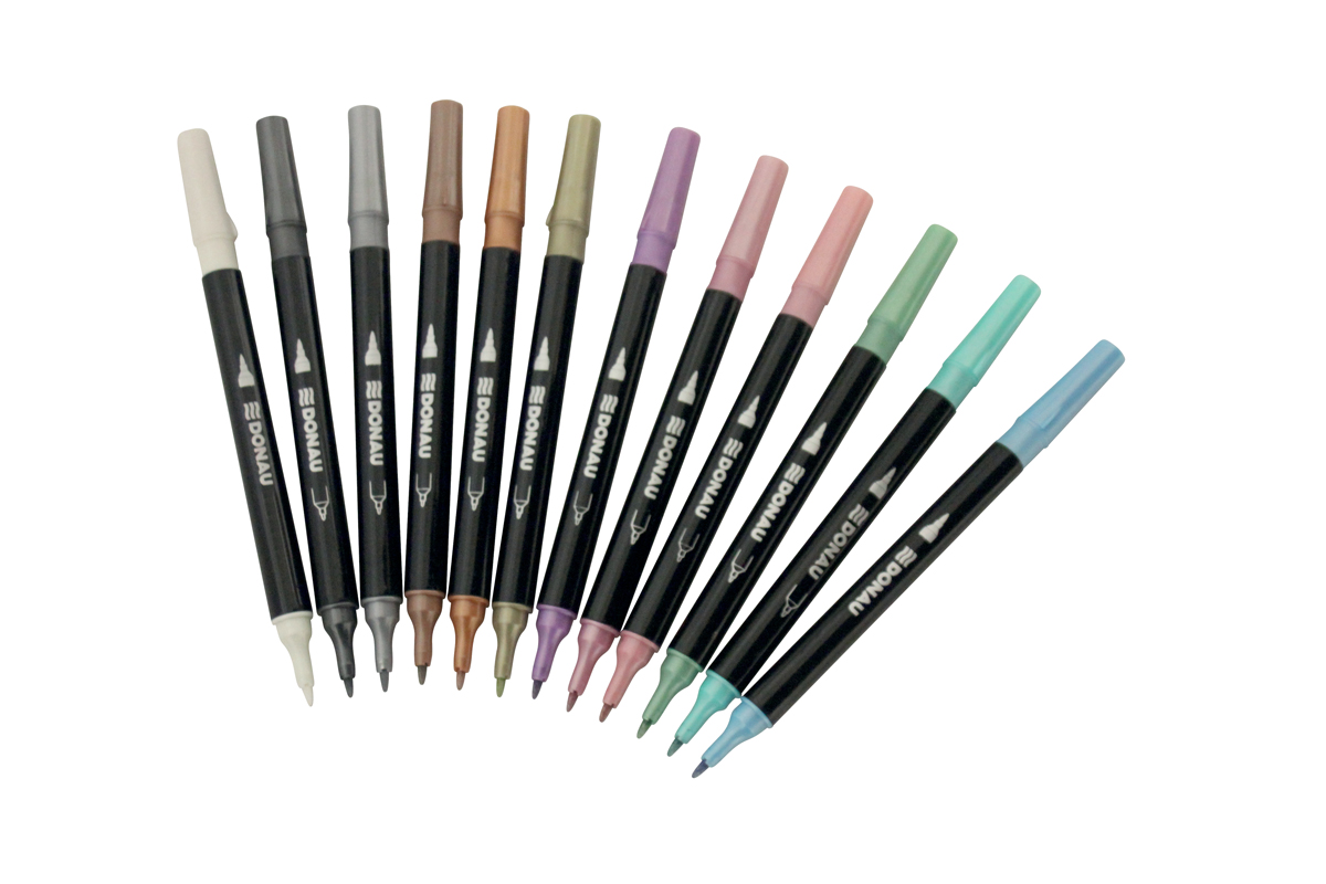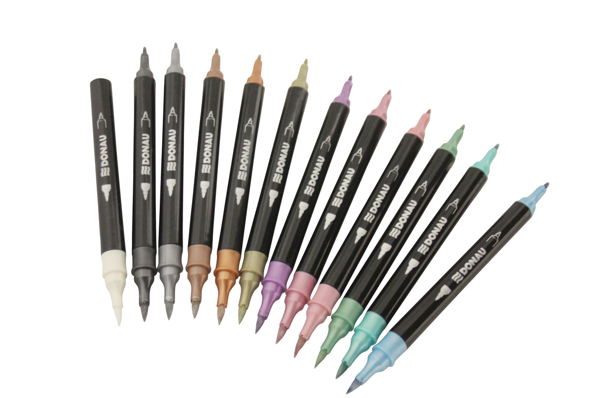 12 kvalitných metalických fixiek s dvojitým hrotom – jemný hrot na presné línie a mäkký štetcový hrot na široké ťahy či vyfarbovanie. Vhodné na rôzne kreatívne techniky – od písania a kreslenia po dekorovanie.