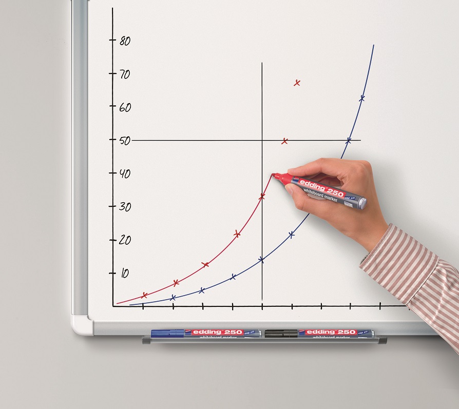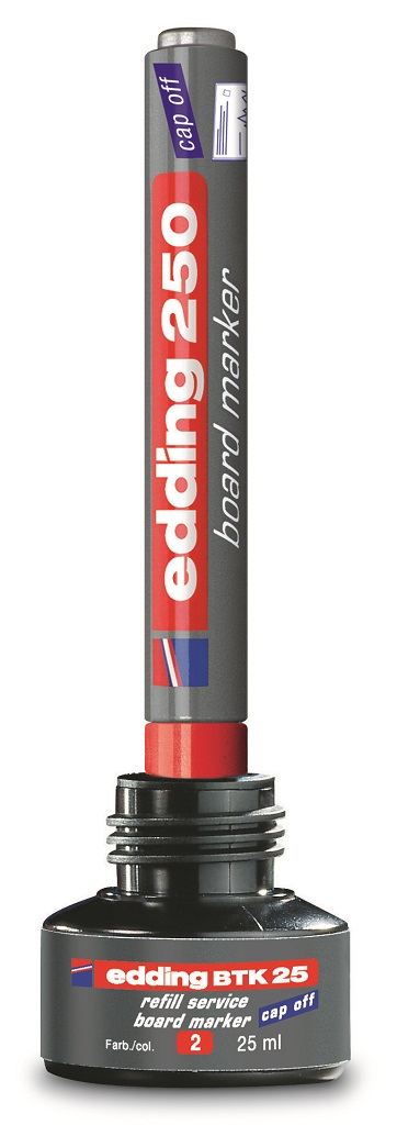 Popisovač na biele tabule, zasucha stierateľný. Plnený pigmentovým atramentom slabého zápachu bez prísady butylacetátu s vlastnosťou `Cap off`, zabraňujúcou vysychaniu atramentu pri otvorenom hrote aj niekoľko dní. Dopĺňateľný atramentom edding BT 30 alebo BTK 25. Hliníkové telo, vymeniteľný hrot. Hrot okrúhly, šírka stopy 1,5 – 3 mm. Dodávaný v sade 4 ks.