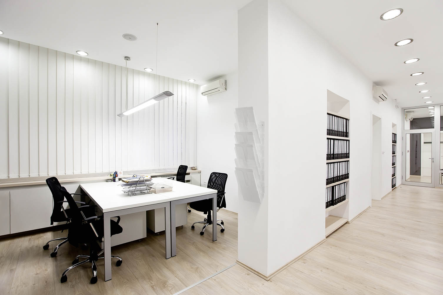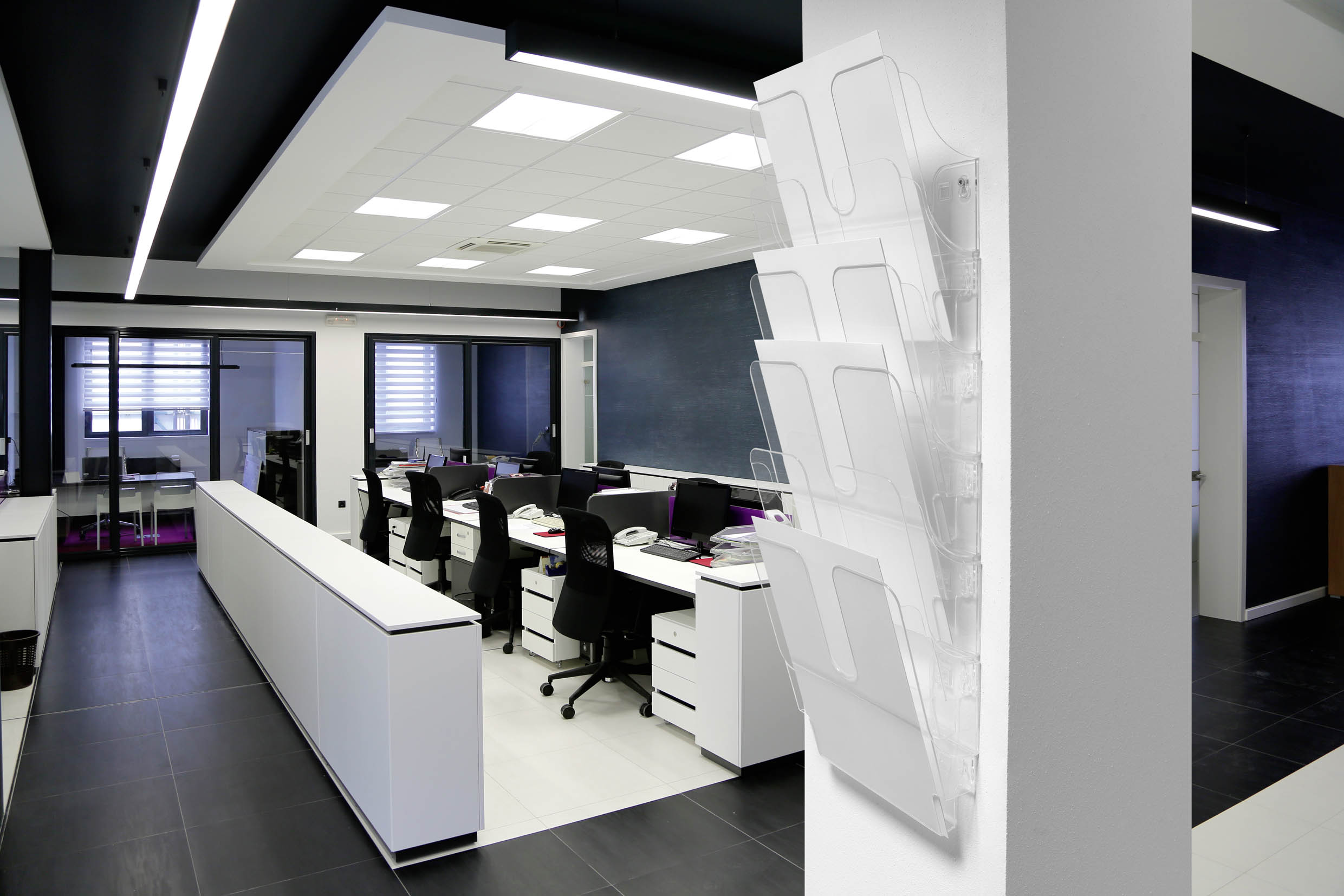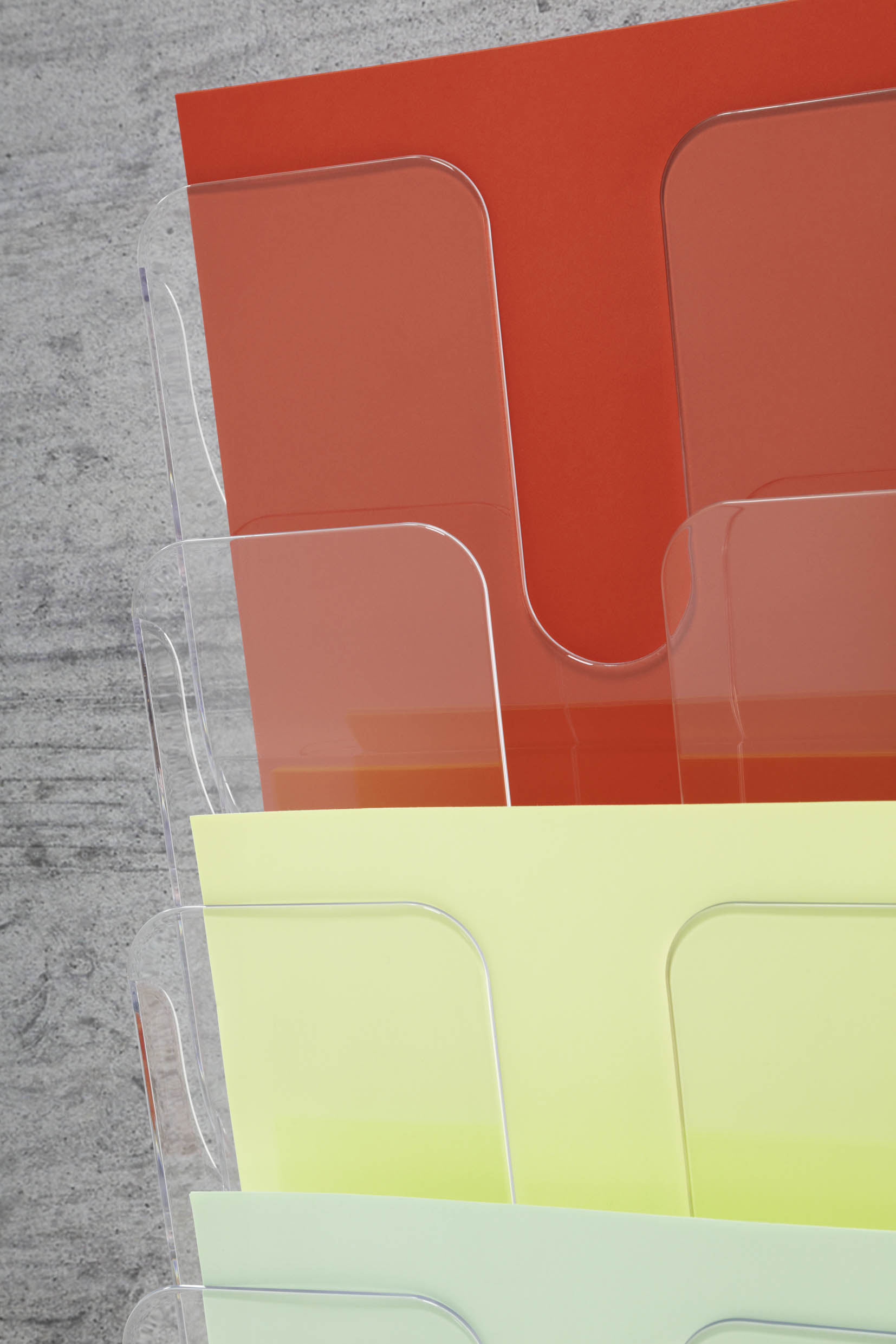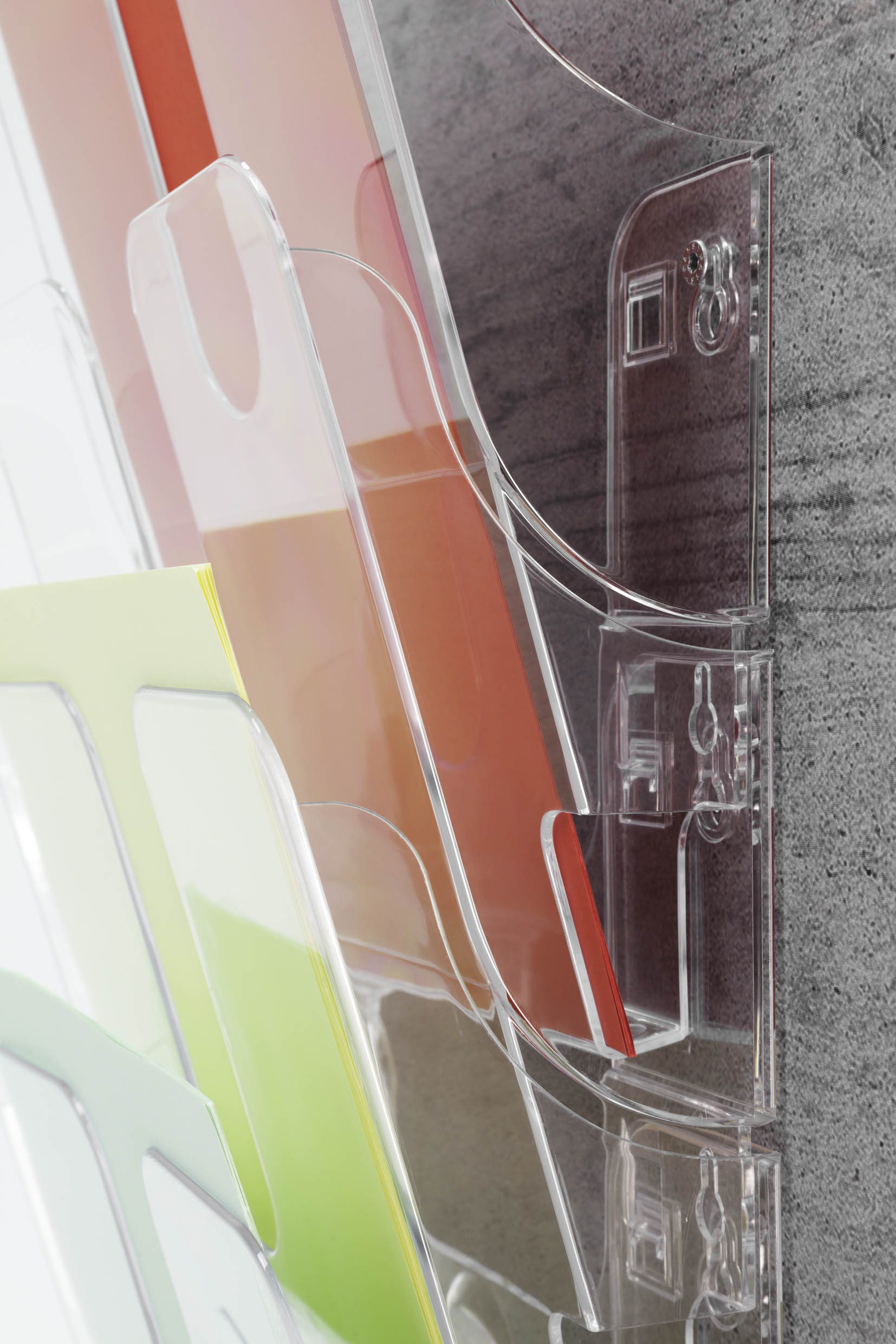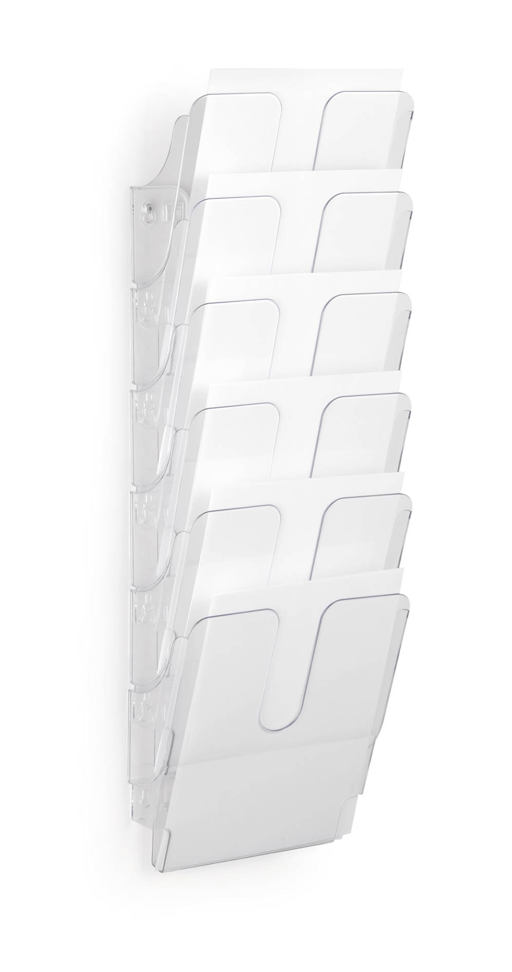 Sada stojanov na prospekty so 6 priehradkami veľkosti A4 na letáky, časopisy, firemnú literatúru a ďalšie. Vyrobená z priehľadného plastu odolného voči opotrebeniu. Vhodná na montáž na stenu, na vystavenie literatúry na recepciách a v kanceláriiách. Rozmery : 1080mm x 247mm x 100mm. Farba priehľadná.