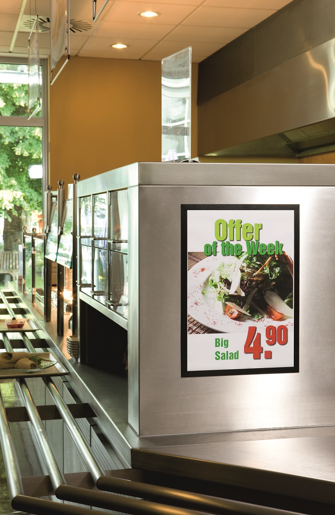 Samolepiaci informačný panel s prednou magnetickou časťou. Ideálny na vystavovanie plagátov, kľúčových informácií, špeciálnych oznamov alebo dôležitých čísel. Informácie sa ľahko vymieňajú a sú čitateľné z oboch strán, ak sa panel umiestni napr. na okno alebo priehľadné dvere. Vhodný na hladké a pevné povrchy. V prípade potreby je ľahko premiestniteľný bez potreby vŕtania. Formát A3, rámik čierny.