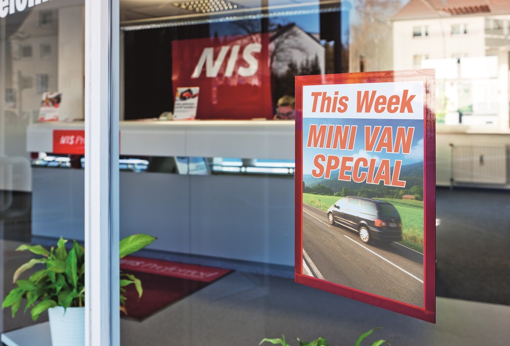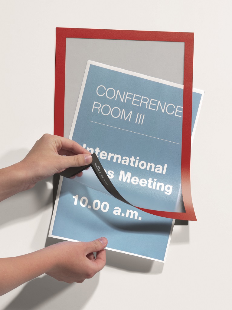Samolepiaci informačný panel s prednou magnetickou časťou. Ideálny na vystavovanie plagátov, kľúčových informácií, špeciálnych oznamov alebo dôležitých čísel. Informácie sa ľahko vymieňajú a sú čitateľné z oboch strán, ak sa panel umiestni napr. na okno alebo priehľadné dvere. Vhodný na hladké a pevné povrchy. V prípade potreby je ľahko premiestniteľný bez potreby vŕtania. Formát A4, rámik červený.
