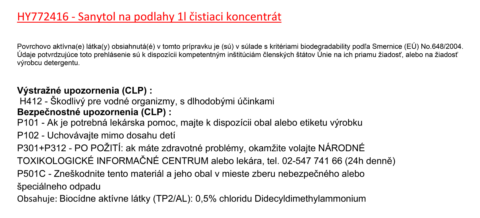 Obsahuje: Biocídne aktívne látky (TP2/AL): 0,5% chloridu Didecyldimethylammonium