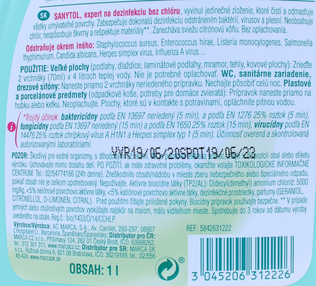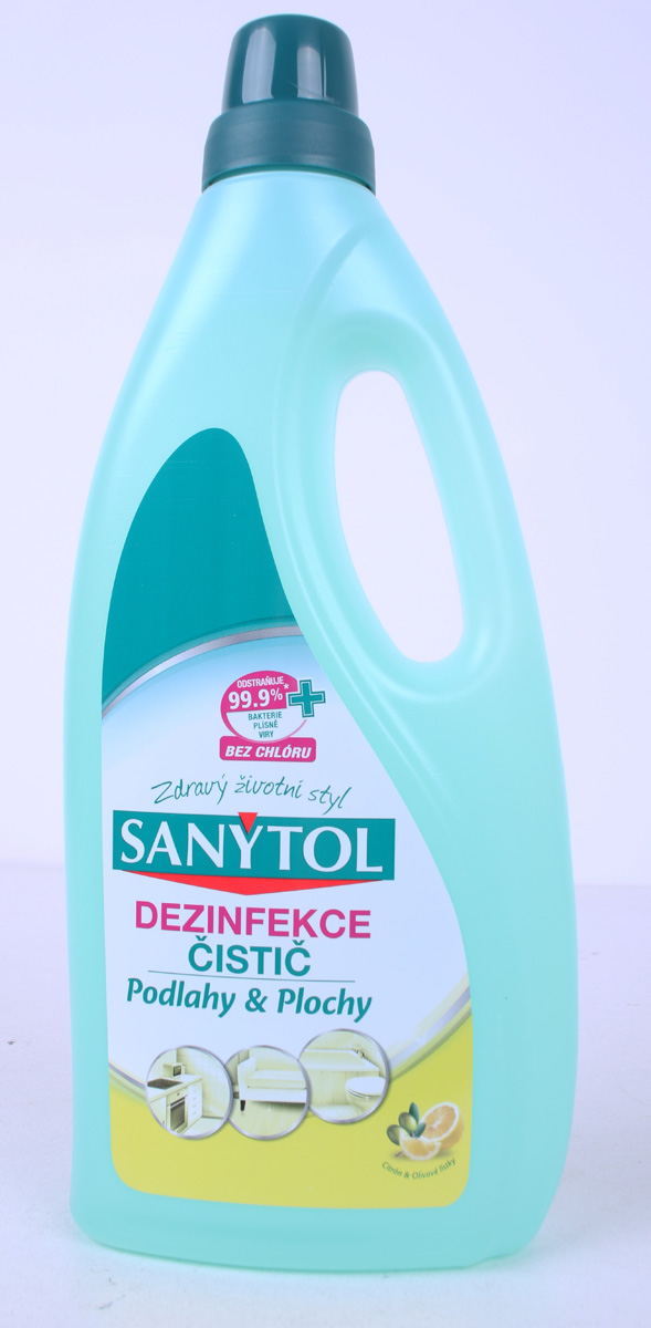 SANYTOL, expert na dezinfekciu bez chlóru vyvinul jedinečné zloženie, ktoré čistia a odmasťuje všetky umývateľné povrchy. Zaisťuje dokonalú dezinfekciu odstránením baktérií, vírusov a plesní. Neobsahuje chlór, nespôsobuje škvrny a rešpektuje materiály. Odstraňuje 99,99% baktérií, plesní a vírusov. Zanecháva sviežu citrónovú vôňu. Odstraňuje mimo iného: Staphylococcus aureus, Enterococcus Hiram, Listeria onocytogenes, Salmonella thyphimurium, Candida albicans, Herpes simplex vírus, Influenza A vírus .Trojaký účinok: baktericídne podľa EN 13697 neriedený (5 min), a podľa EN 1276 25% roztok (5 min), fungicídny podľa EN 13697 neriedený (15 min) a podľa EN 1650 25% roztok (15 min), virucidné podľa EN 14476 25% roztok chrípkový vírus A H1N1 a Herpes simplex typ 1 (5 min).