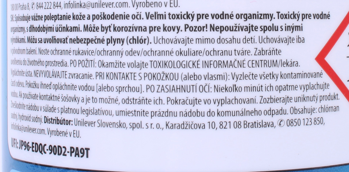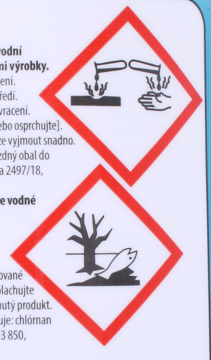 Spôsobuje vážne poleptanie kože a poškodenie očí. Veľmi toxický pre vodné organizmy. Toxický pre vodné organizmy, s dlhodobými účinkami. Môže byť korozívna pre kovy. Pozor! Nepoužívajte spolu s inými výrobkami. Môžu sa uvoľňovať nebezpečné plyny (chlór). Uchovávajte mimo dosahu detí. Uchovávajte iba v pôvodnom balení. Noste ochranné rukavice/ ochranný odev/ ochranné okuliare/ ochranu tváre. Zabráňte uvoľneniu do životného prostredia.