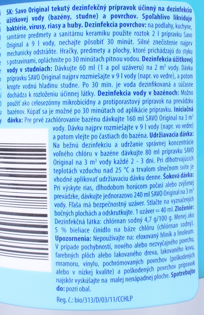 Tekutý dezinfekčný prípravok na dezinfekciu vody a povrchov. Spoľahlivo likviduje baktérie, vírusy, riasy a huby. SAVO Original likviduje choroboplodné zárodky, baktérie a vírusy (vrátane HIV a HBV), riasy a nižšie huby, odstraňuje pachy. Vyniká mimoriadne vysokou čistotou, dlhou záručou lehotou a unikátnou ekologickou hodnotou, pre ktorú je schválený aj pre dezinfekciu vody v bazénoch a ako jediný aj pre pitnú vodu v studniach. Dezinfekcia povrchov:na podlahy, kuchyne, sanitárne predmety a sanitárnu keramiku použite roztok 2 l prípravku Savo original a 9 l vody, nechajte pôsobiť 30 minút. Silné znečistenie najprv mechanicky odstráňte. Hračky, predmety a plochy, ktoré prichádzajú do styku s potravinami, opláchnite po 30 minútach pitnou vodou.