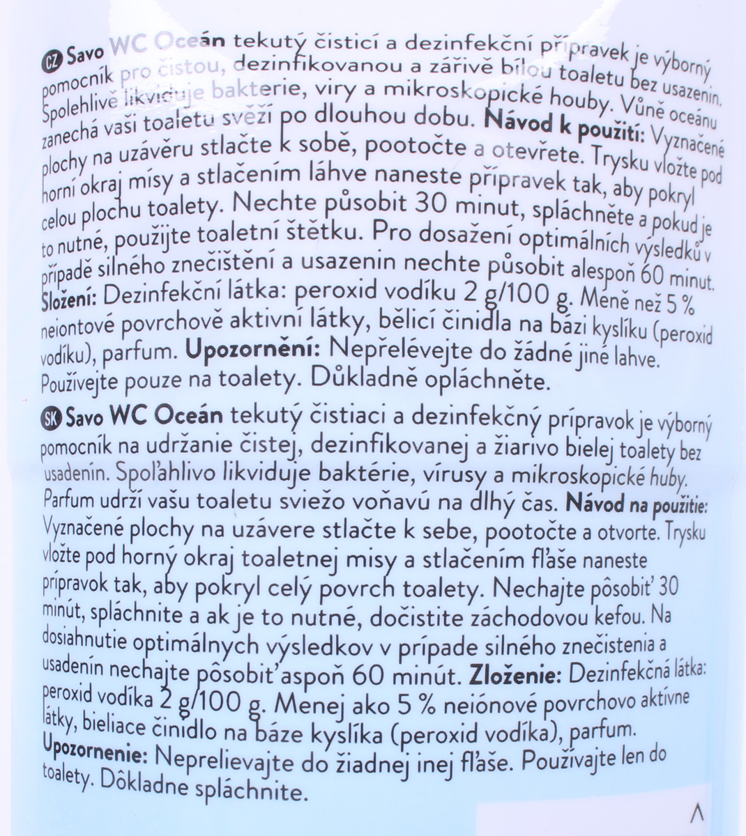 Dezinfekčná látka: peroxid vodíka 2 g/100 g, Menej ako 5 % neiónové povrchovo aktívne látky, Bieliace činidlo na báze kyslíka (peroxid vodíka), Parfum