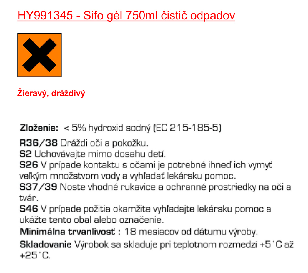 Návod na použitie: Do upchaného sifónu (odpadu) nalejte 1/3 objemu fľaše. Nechajte pôsobiť 45 minút (pri silnejšom znečistení dlhšie). Dôkladne prepláchnite horúcou vodou.