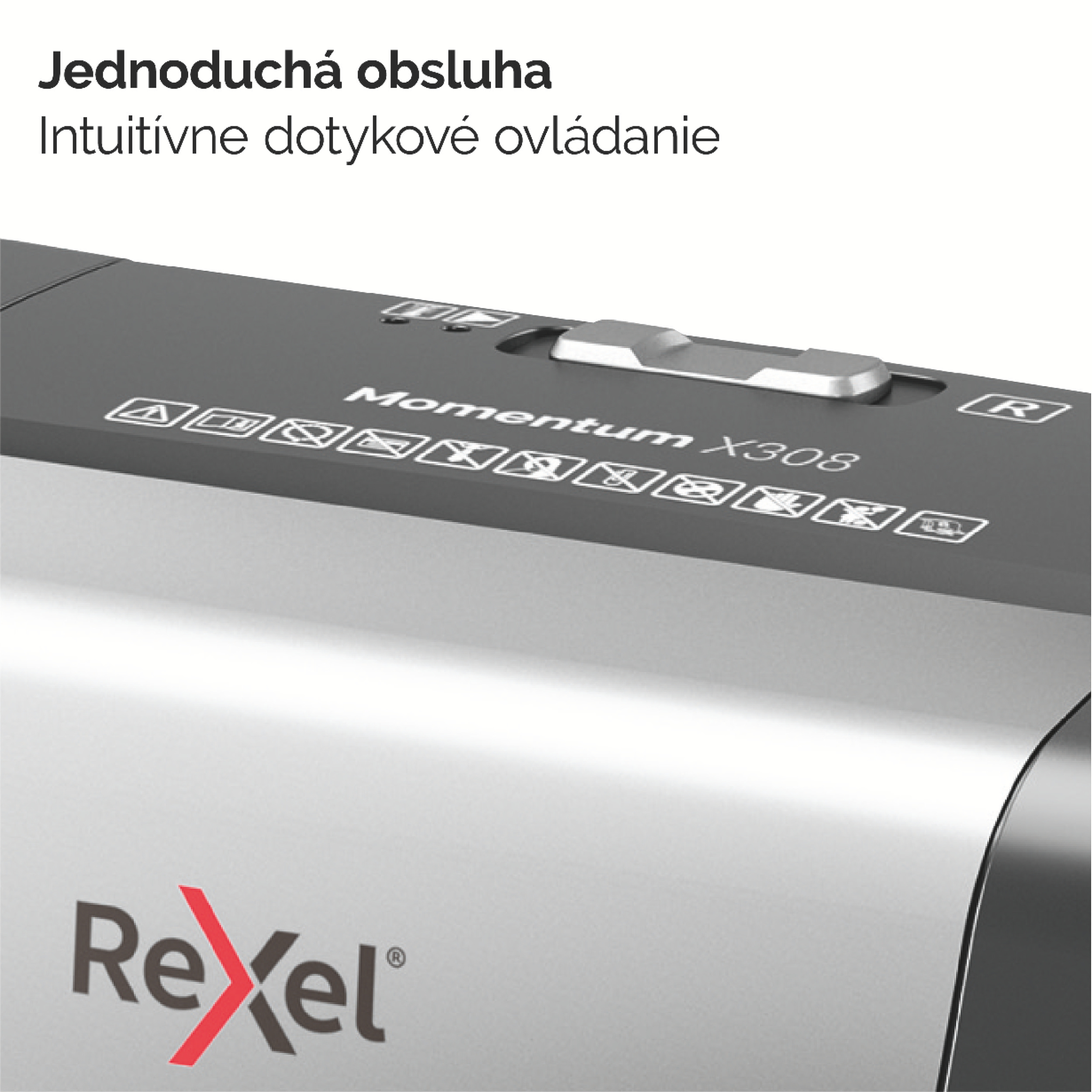 Nezastaviteľná skartovačka! Rexel Momentum X308 skartuje až 8 hárkov naraz a vydrží v nepretržitom chode 3 minúty, vhodná na použitie doma. Krížový rez na úrovni zabezpečenia P3 reže papier na časti s veľkosťou 5 × 42 mm. Odpadový kôš s kapacitou 15 l pojme 100 hárkov A4.