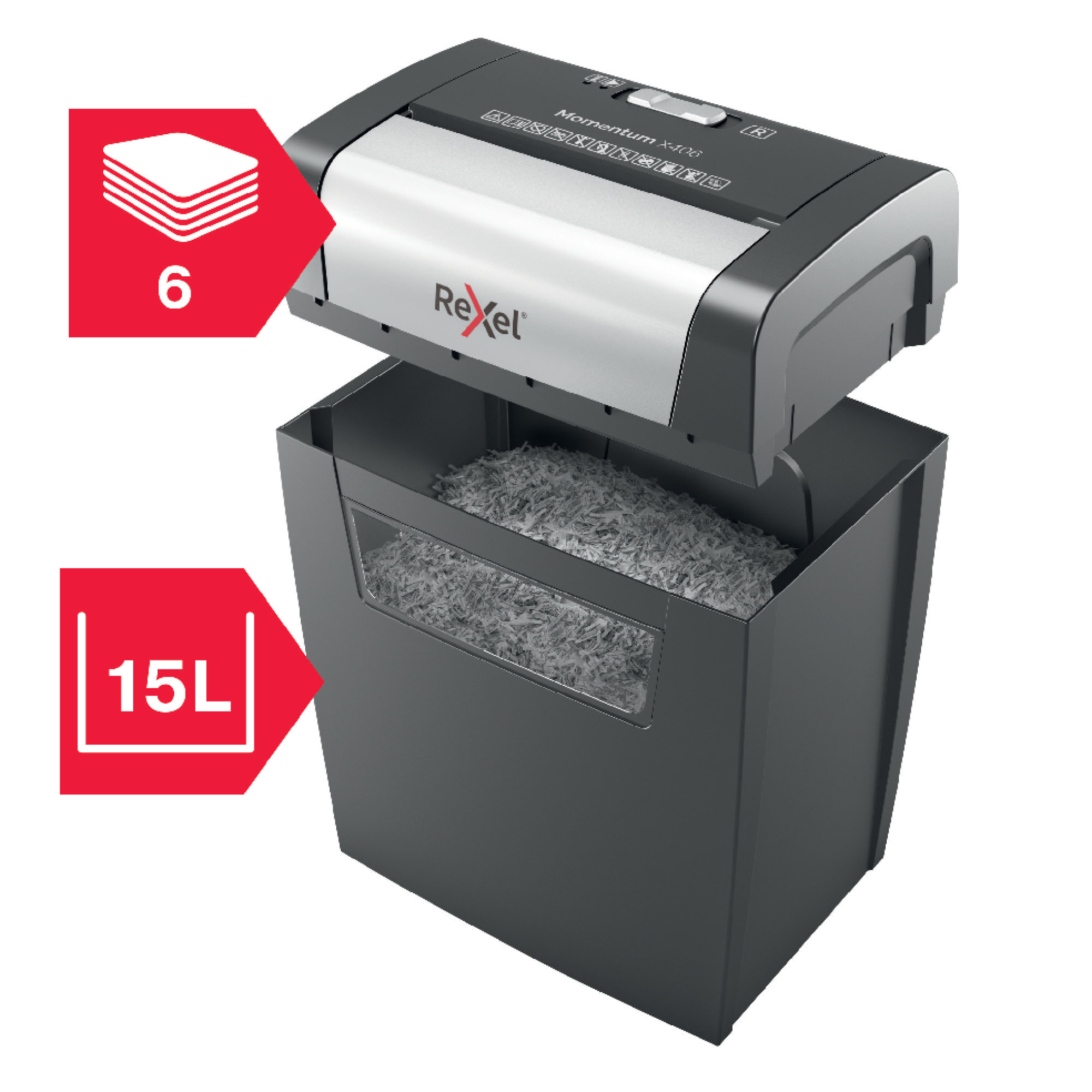 Nezastaviteľná skartovačka! Rexel Momentum X406 skartuje až 6 hárkov naraz a vydrží v nepretržitom chode 3 minúty, vhodná na použitie doma. Krížový rez na úrovni zabezpečenia P4 reže papier na malé časti s veľkosťou 4 × 28 mm. Odpadový kôš s kapacitou 15 l pojme 125 hárkov A4.