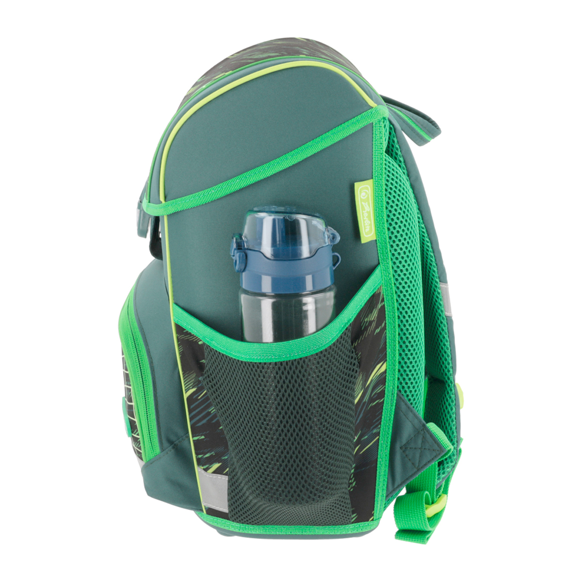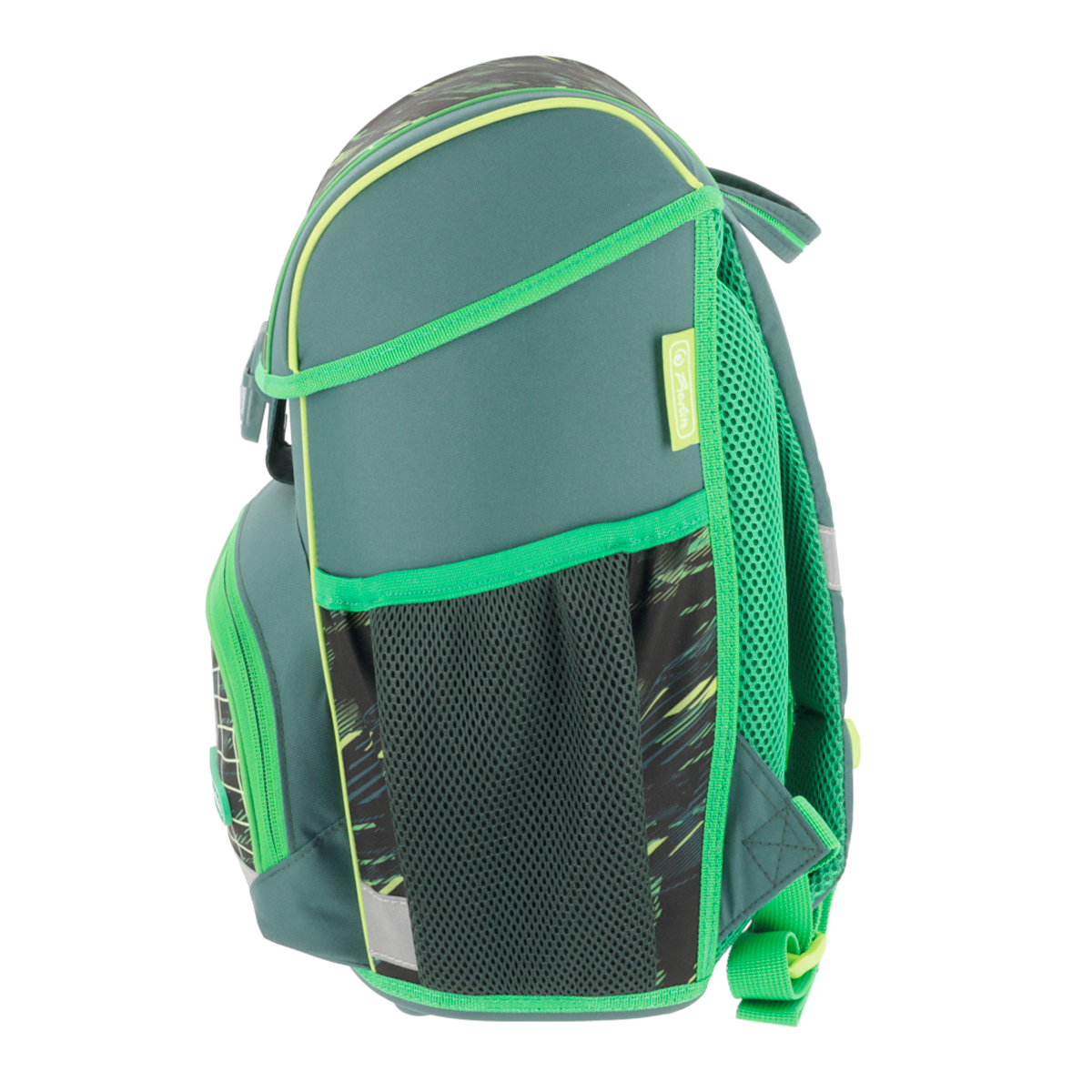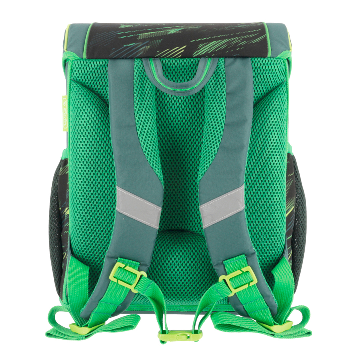 Školská taška s výbavou, ergonomicky tvarovaným a priedušným polstrovaním chrbta, nastaviteľnými ramennými popruhmi, výškovo nastaviteľným hrudným pásom, hlavným vreckom s priestorom na knihy, bočnými vreckami s elastickými pásikmi, predným vreckom na zips, stabilnou spodnou doskou s nožičkami, pohodlnou rukoväťou a reflexnými prvkami Oralite. Hmotnosť 950 g, objem 16 l, rozmery 37 x 31 x 22 cm. Vode-odolná, bez PVC, výbava: peračník, vrecko na prezuvky, okrúhle puzdro. Certifikát ergonómie 2023 a 2025. Materiál: Polyester.