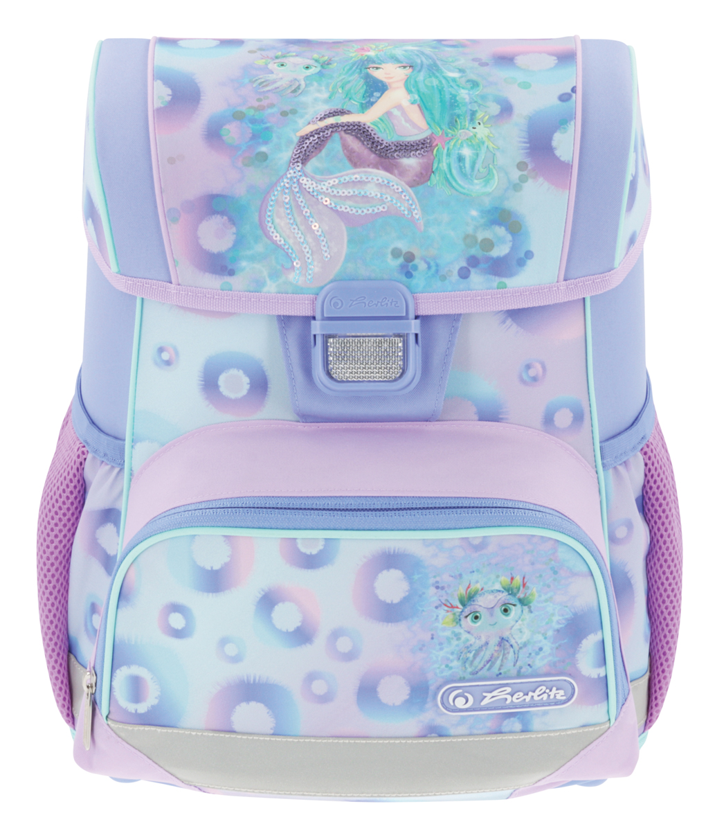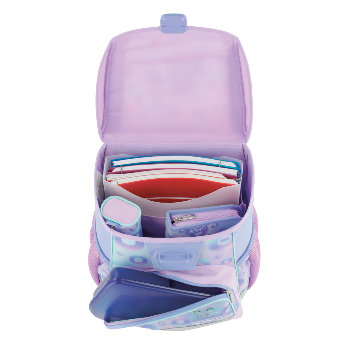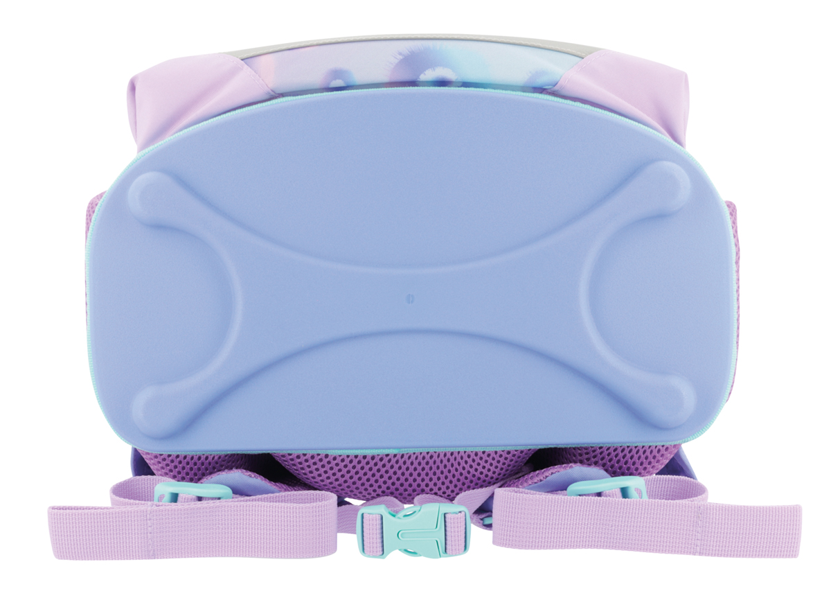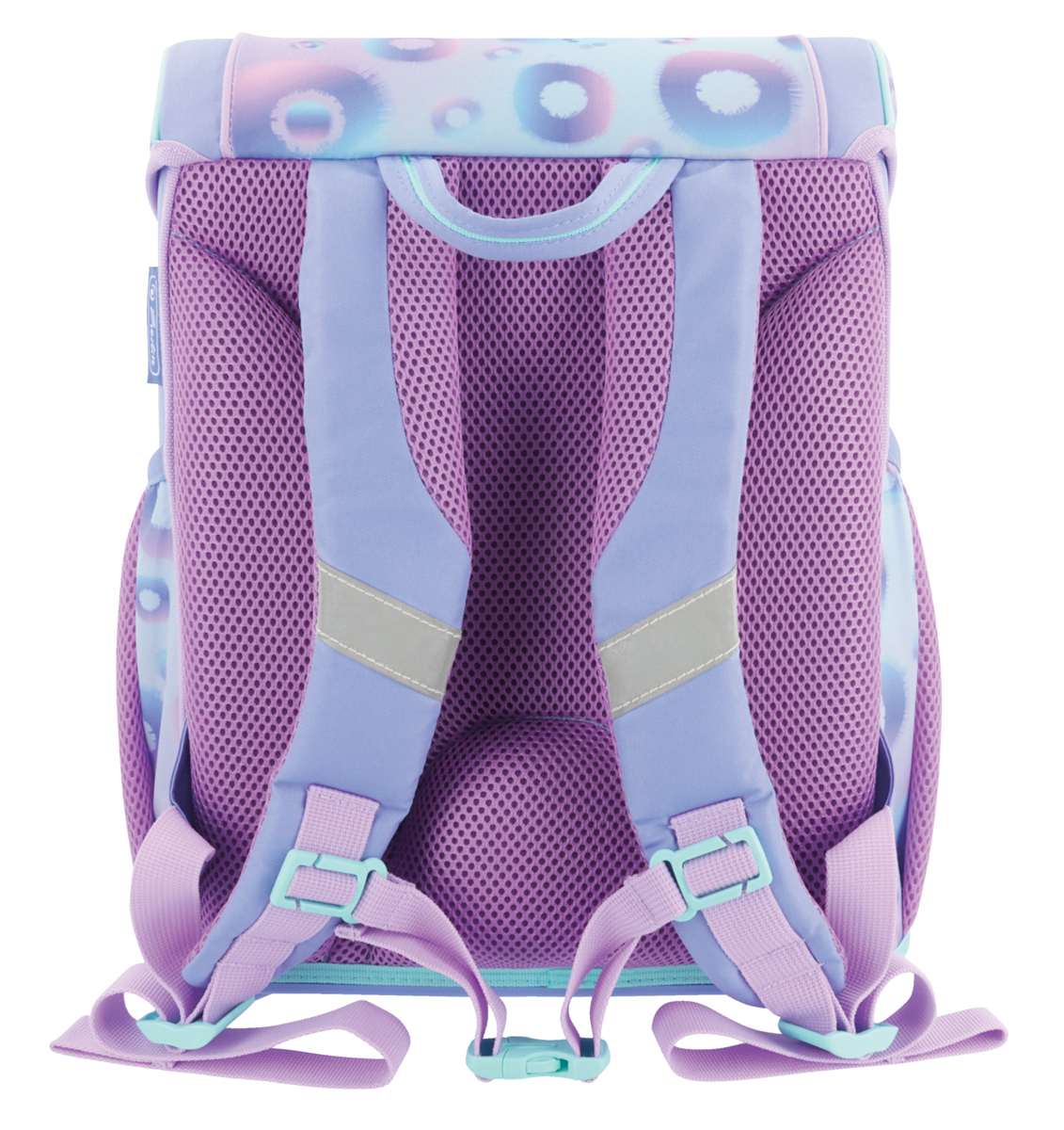 Školská taška s výbavou, ergonomicky tvarovaným a priedušným polstrovaním chrbta, nastaviteľnými ramennými popruhmi, výškovo nastaviteľným hrudným pásom, hlavným vreckom s priestorom na knihy, bočnými vreckami s elastickými pásikmi, predným vreckom na zips, stabilnou spodnou doskou s nožičkami, pohodlnou rukoväťou a reflexnými prvkami Oralite. Hmotnosť 950 g, objem 16 l, rozmery 37 x 31 x 22 cm. Vode-odolná, bez PVC, výbava: peračník, vrecko na prezuvky, okrúhle puzdro. Certifikát ergonómie 2023 a 2025. Materiál: polyester.