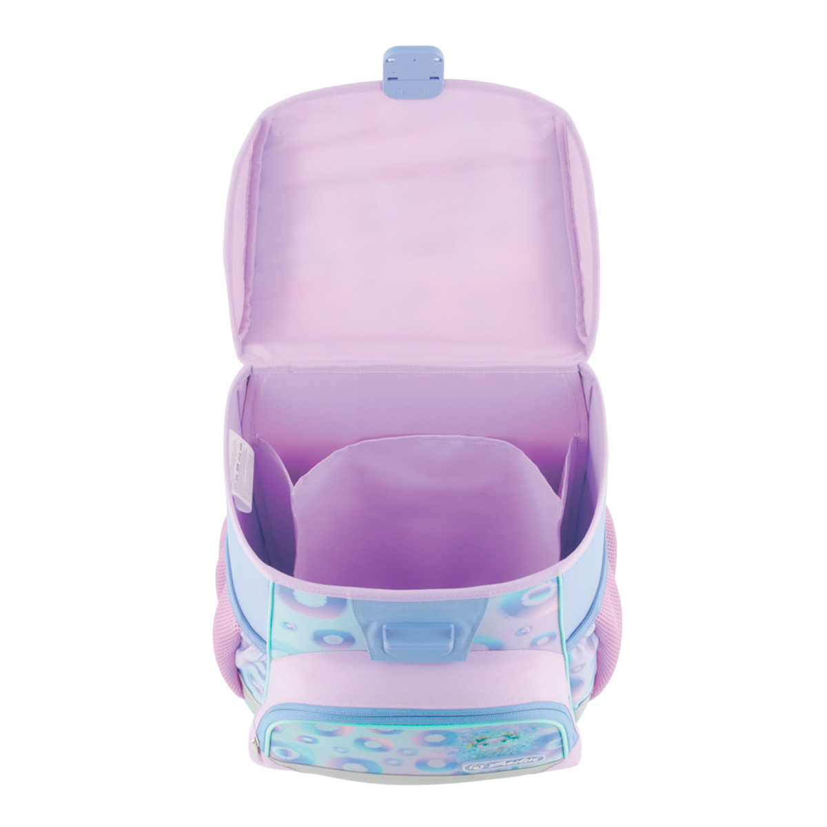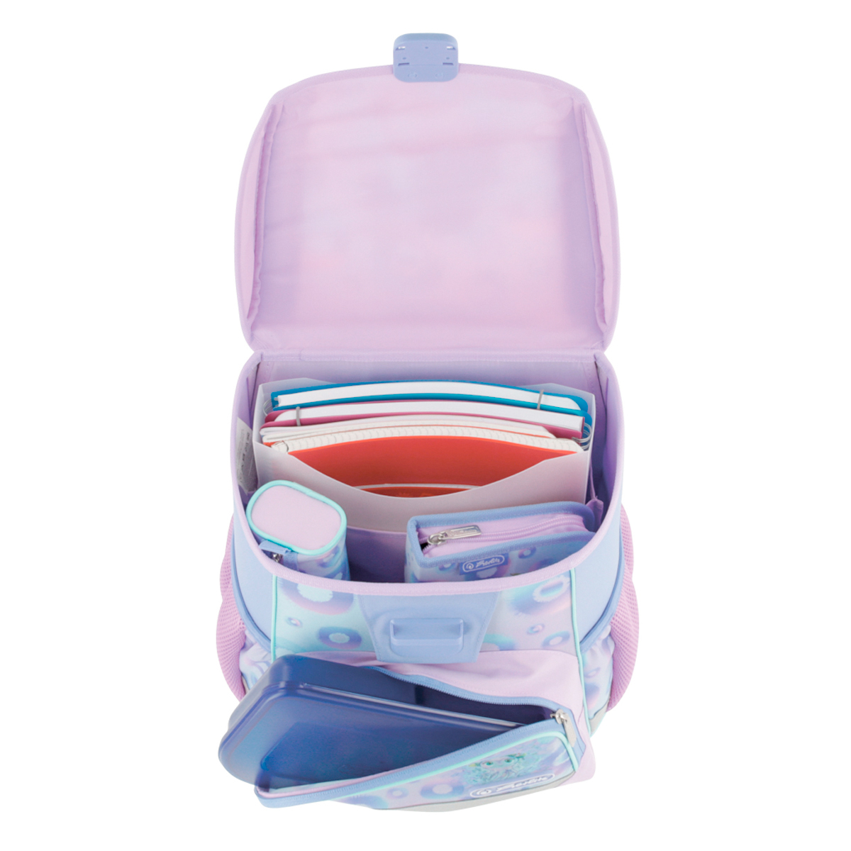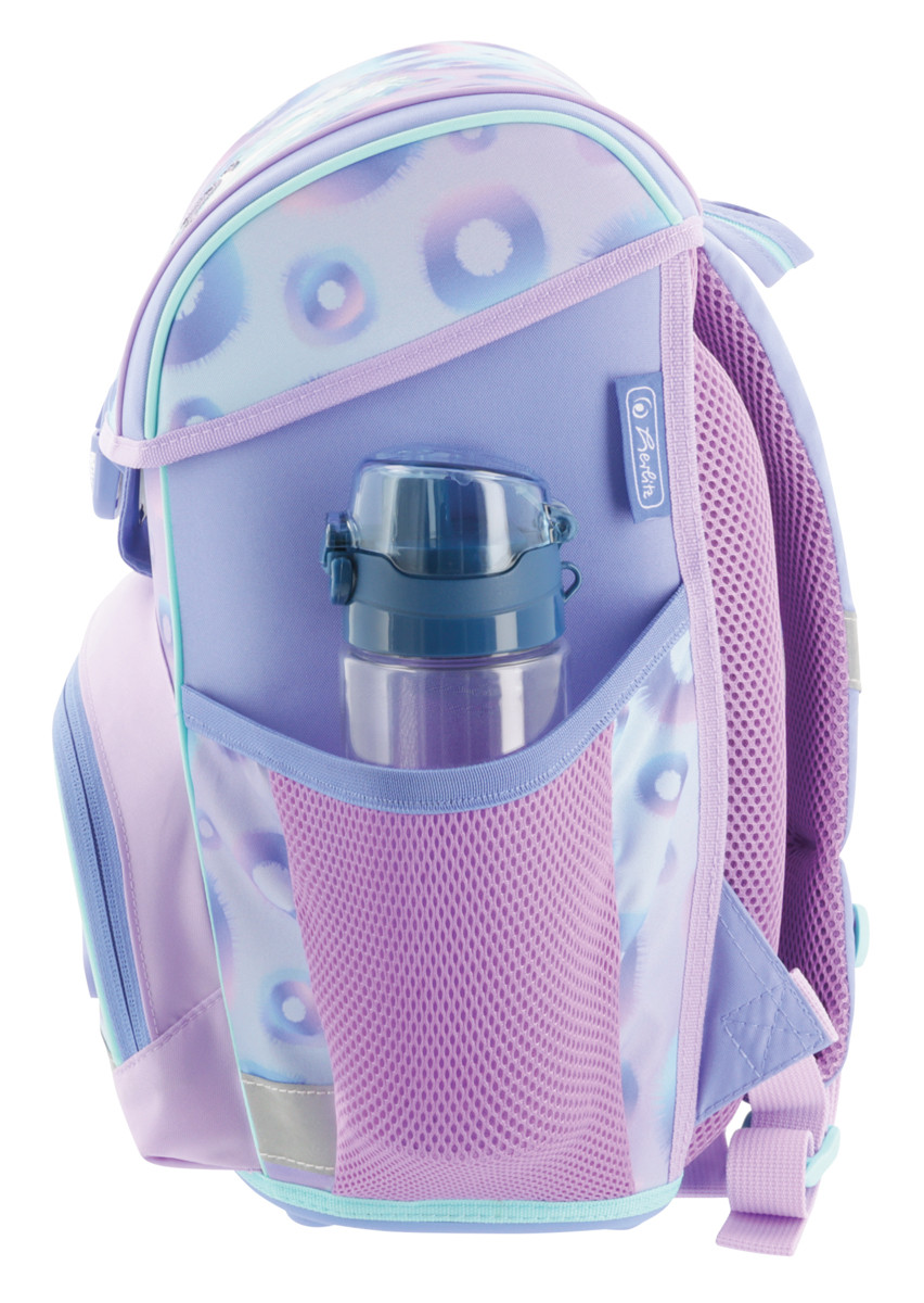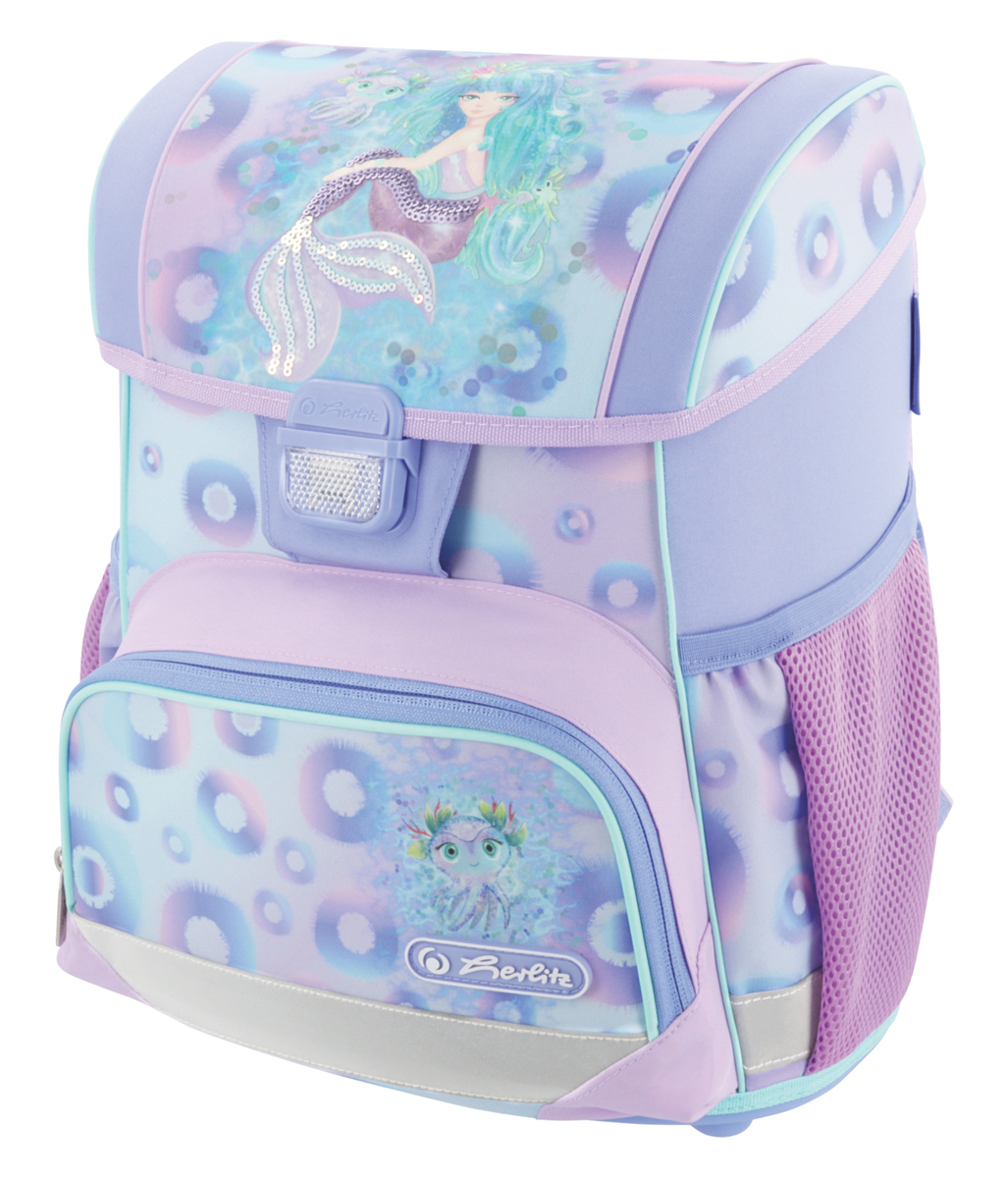 Školská taška s výbavou, ergonomicky tvarovaným a priedušným polstrovaním chrbta, nastaviteľnými ramennými popruhmi, výškovo nastaviteľným hrudným pásom, hlavným vreckom s priestorom na knihy, bočnými vreckami s elastickými pásikmi, predným vreckom na zips, stabilnou spodnou doskou s nožičkami, pohodlnou rukoväťou a reflexnými prvkami Oralite. Hmotnosť 950 g, objem 16 l, rozmery 37 x 31 x 22 cm. Vode-odolná, bez PVC, výbava: peračník, vrecko na prezuvky, okrúhle puzdro. Certifikát ergonómie 2023 a 2025. Materiál: polyester.