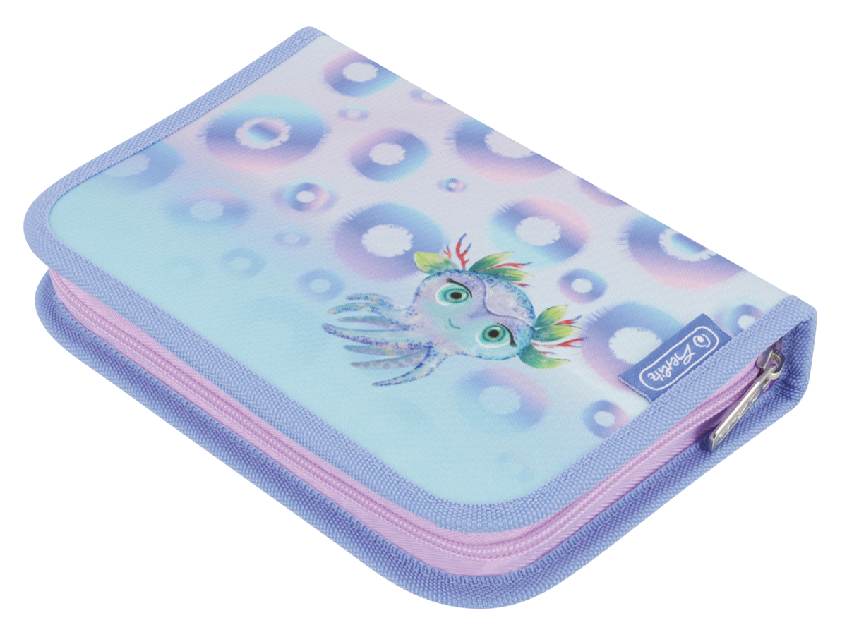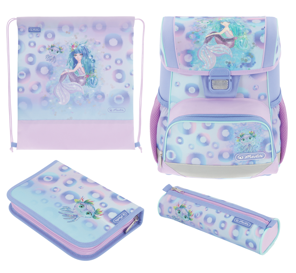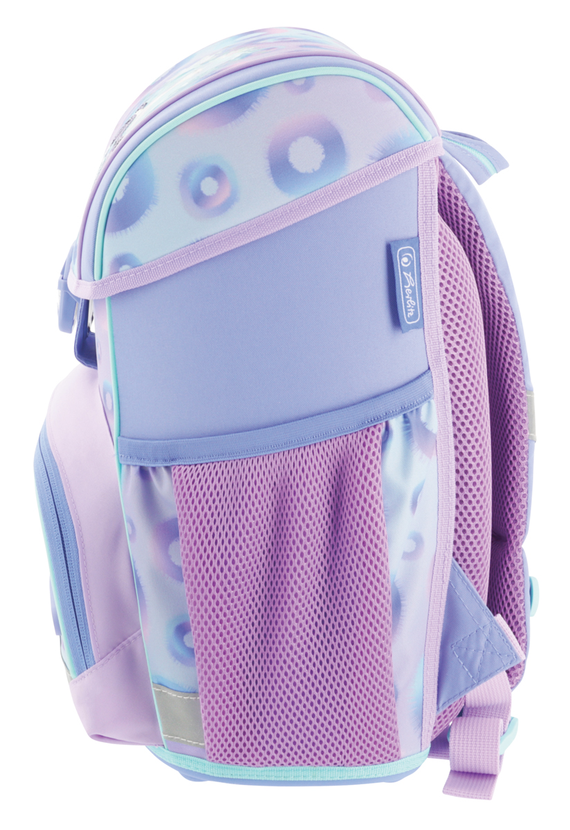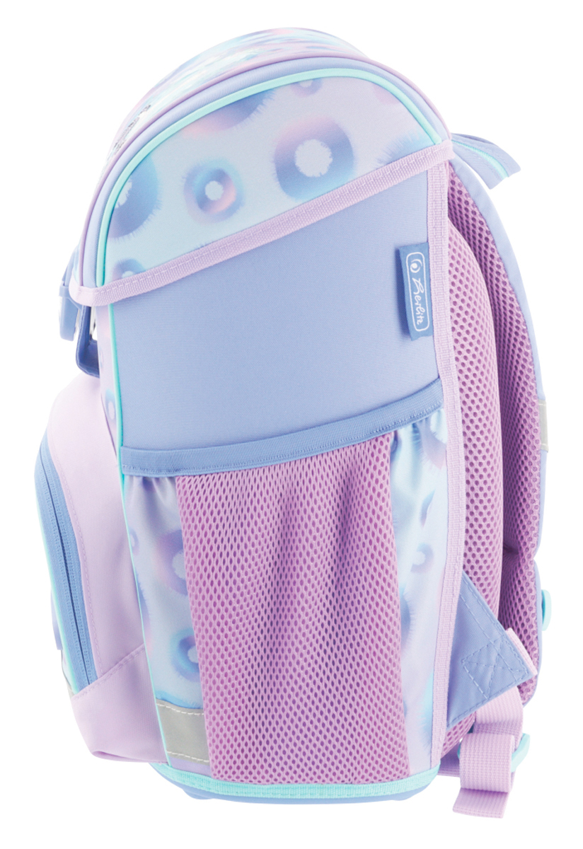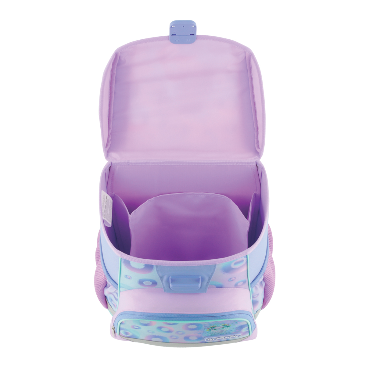 Školská taška s výbavou, ergonomicky tvarovaným a priedušným polstrovaním chrbta, nastaviteľnými ramennými popruhmi, výškovo nastaviteľným hrudným pásom, hlavným vreckom s priestorom na knihy, bočnými vreckami s elastickými pásikmi, predným vreckom na zips, stabilnou spodnou doskou s nožičkami, pohodlnou rukoväťou a reflexnými prvkami Oralite. Hmotnosť 950 g, objem 16 l, rozmery 37 x 31 x 22 cm. Vode-odolná, bez PVC, výbava: peračník, vrecko na prezuvky, okrúhle puzdro. Certifikát ergonómie 2023 a 2025. Materiál: polyester.