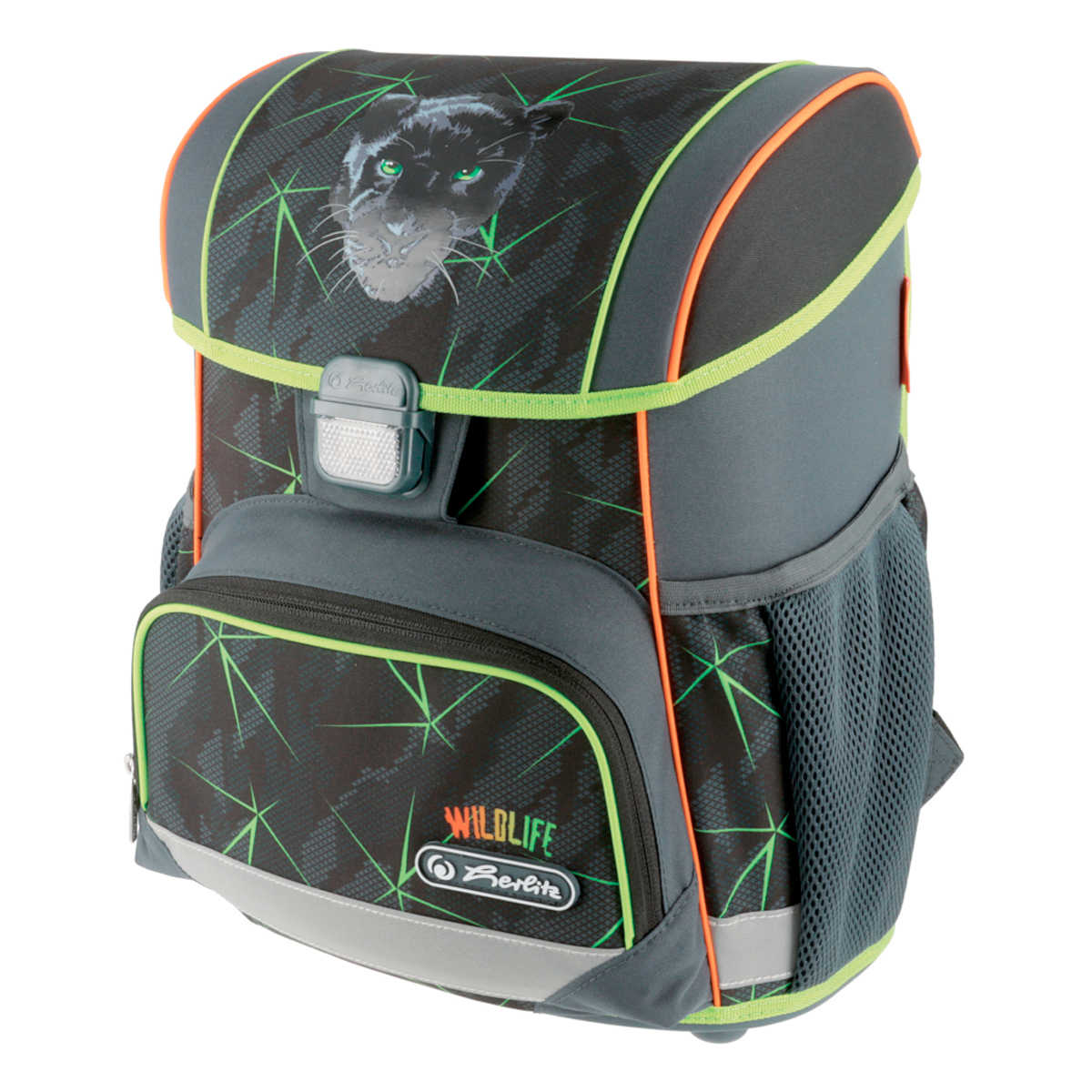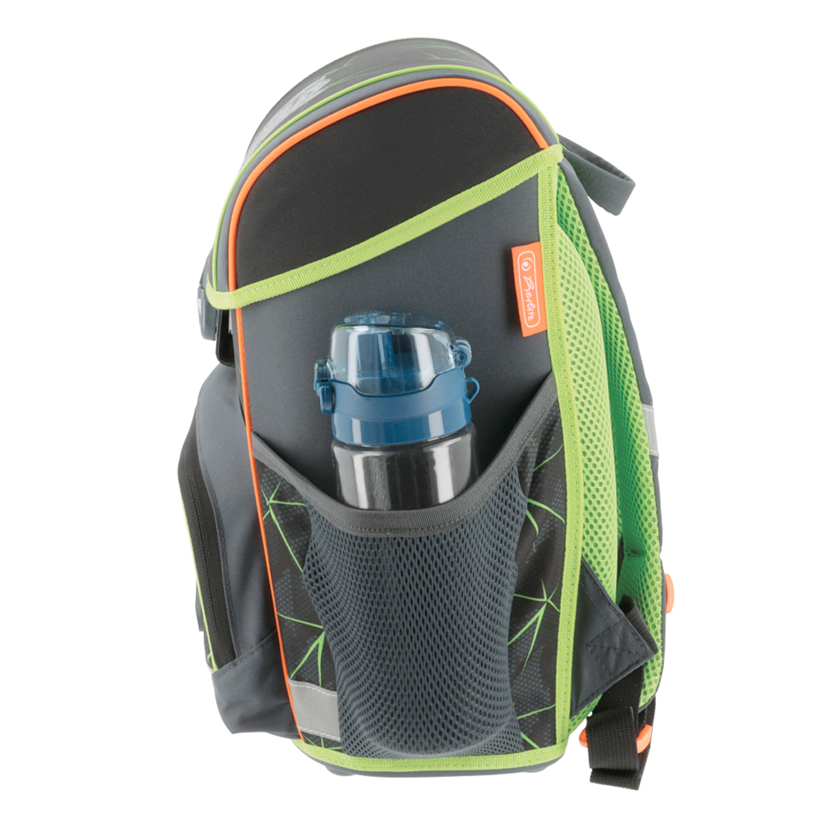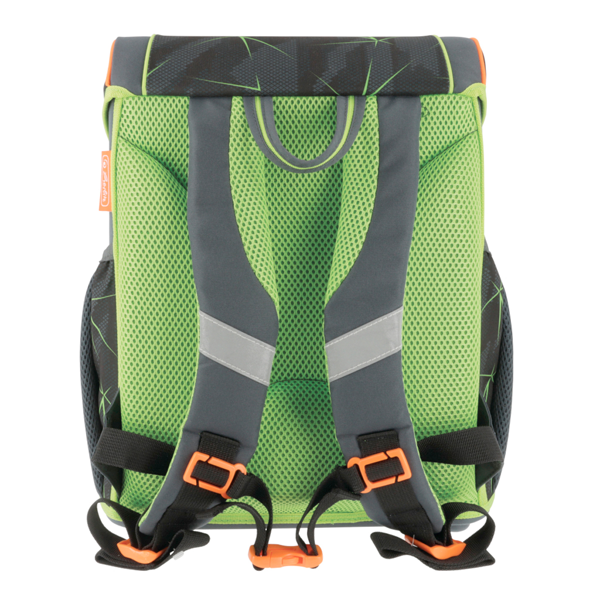 Školská taška s výbavou, ergonomicky tvarovaným a priedušným polstrovaním chrbta, nastaviteľnými ramennými popruhmi, výškovo nastaviteľným hrudným pásom, hlavným vreckom s priestorom na knihy, bočnými vreckami s elastickými pásikmi, predným vreckom na zips, stabilnou spodnou doskou s nožičkami, pohodlnou rukoväťou a reflexnými prvkami Oralite. Hmotnosť 950 g, objem 16 l, rozmery 37 x 31 x 22 cm. Vode-odolná, bez PVC, výbava: peračník, vrecko na prezuvky, okrúhle puzdro. Certifikát ergonómie 2023 a 2025. Materiál: polyester.