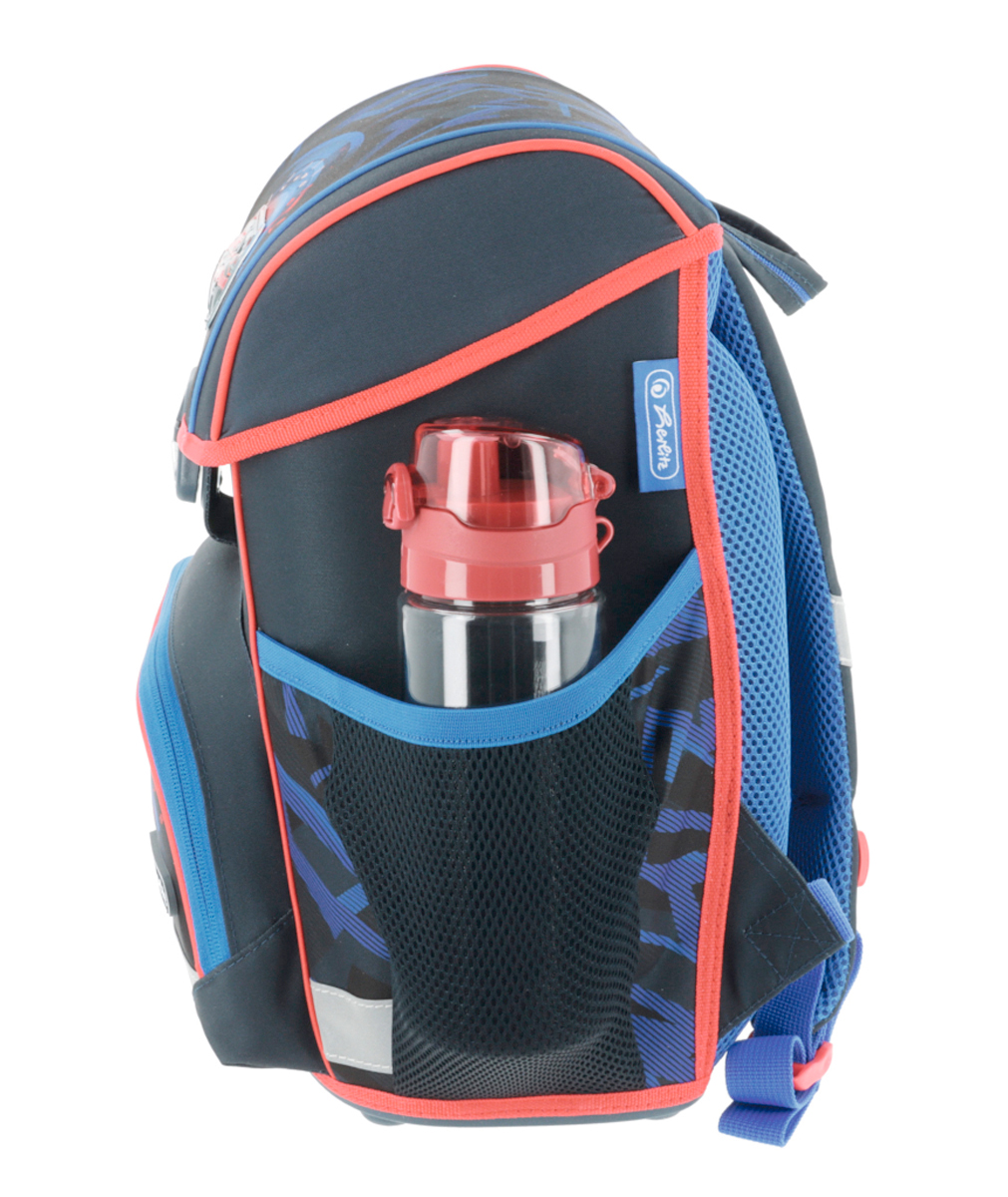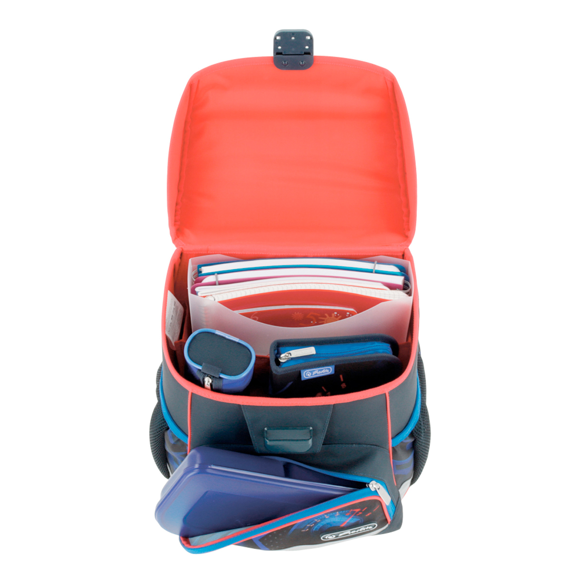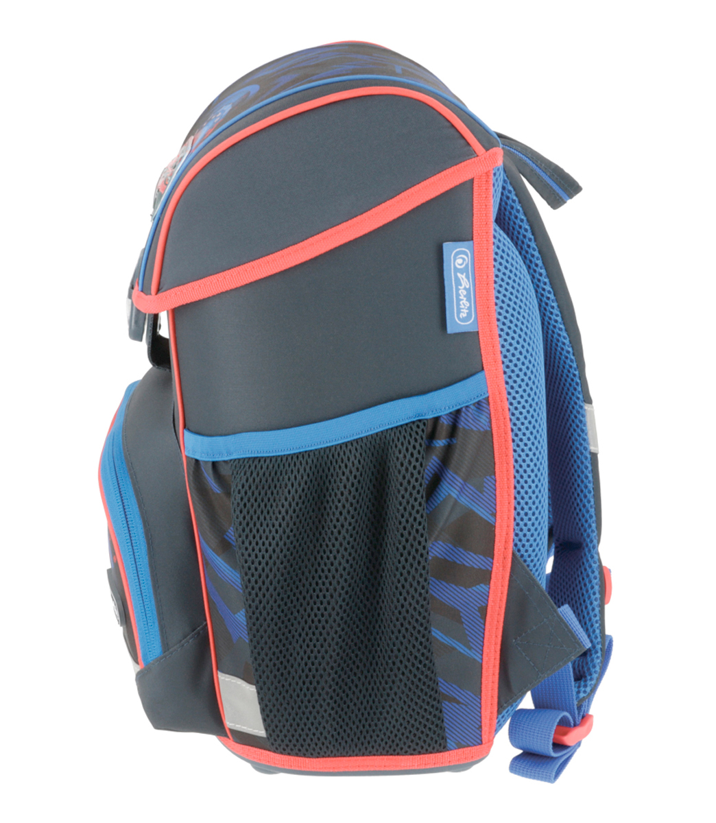 Školská taška s výbavou, ergonomicky tvarovaným a priedušným polstrovaním chrbta, nastaviteľnými ramennými popruhmi, výškovo nastaviteľným hrudným pásom, hlavným vreckom s priestorom na knihy, bočnými vreckami s elastickými pásikmi, predným vreckom na zips, stabilnou spodnou doskou s nožičkami, pohodlnou rukoväťou a reflexnými prvkami Oralite. Hmotnosť 950 g, objem 16 l, rozmery 37 x 31 x 22 cm. Vode-odolná, bez PVC, výbava: peračník, vrecko na prezuvky, okrúhle puzdro. Certifikát ergonómie 2023 a 2025. Materiál: polyester.