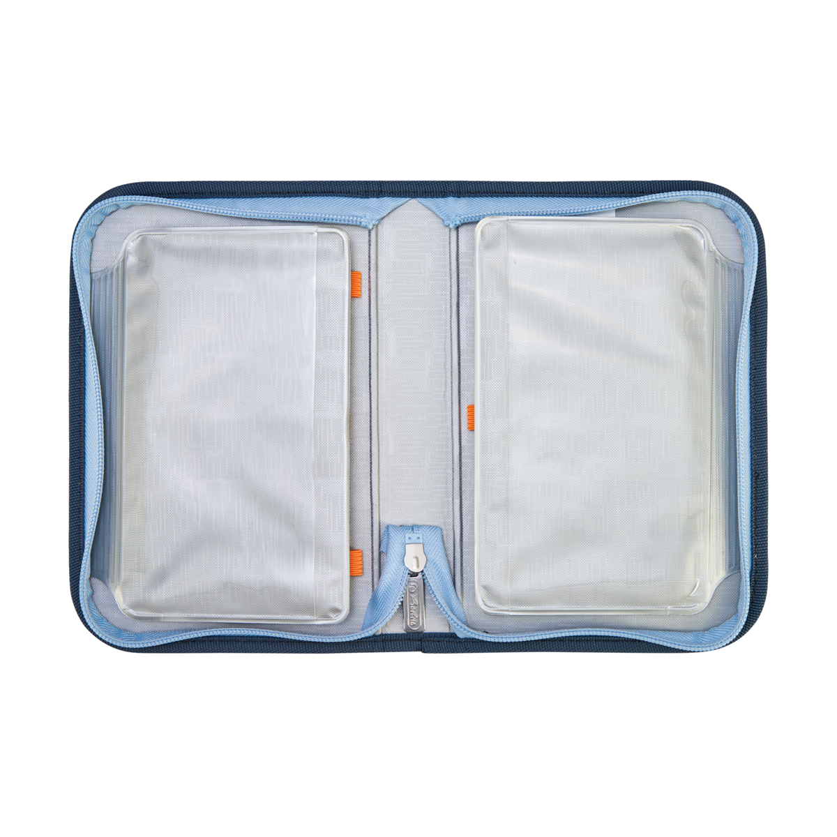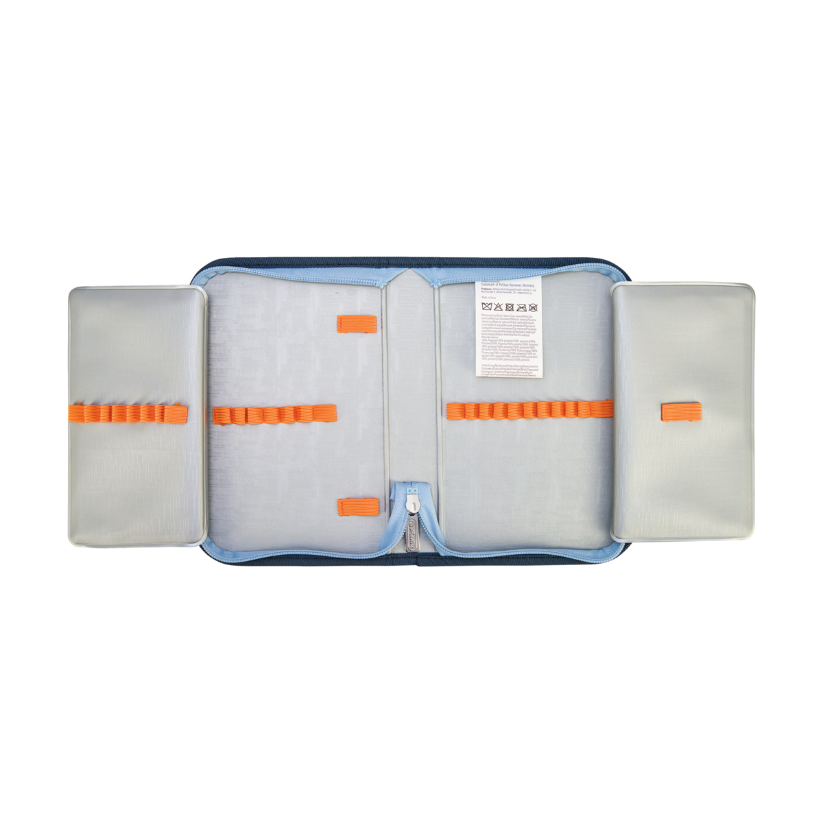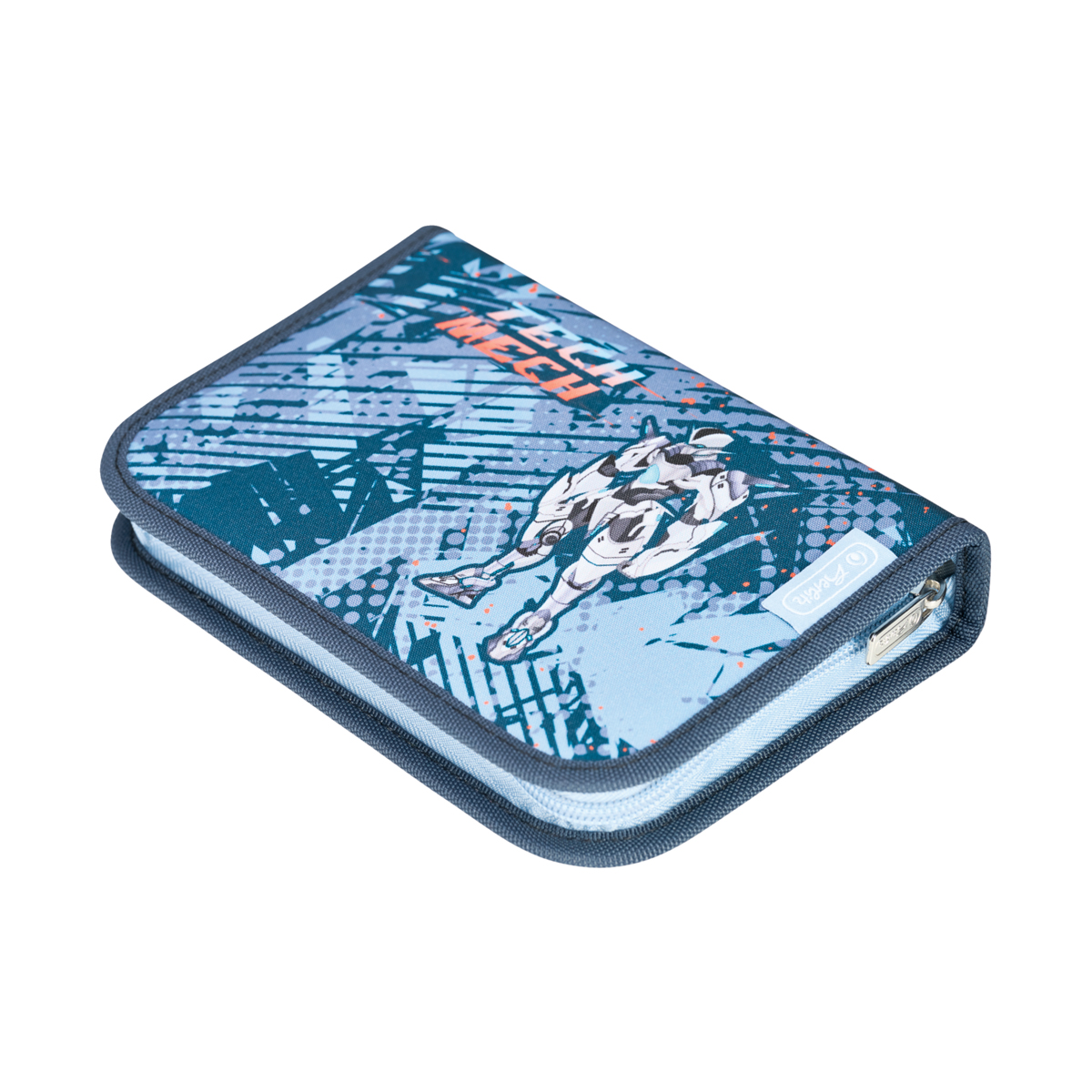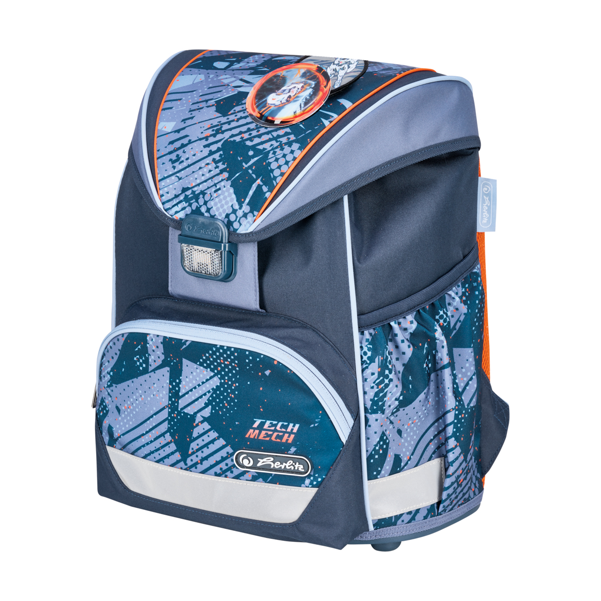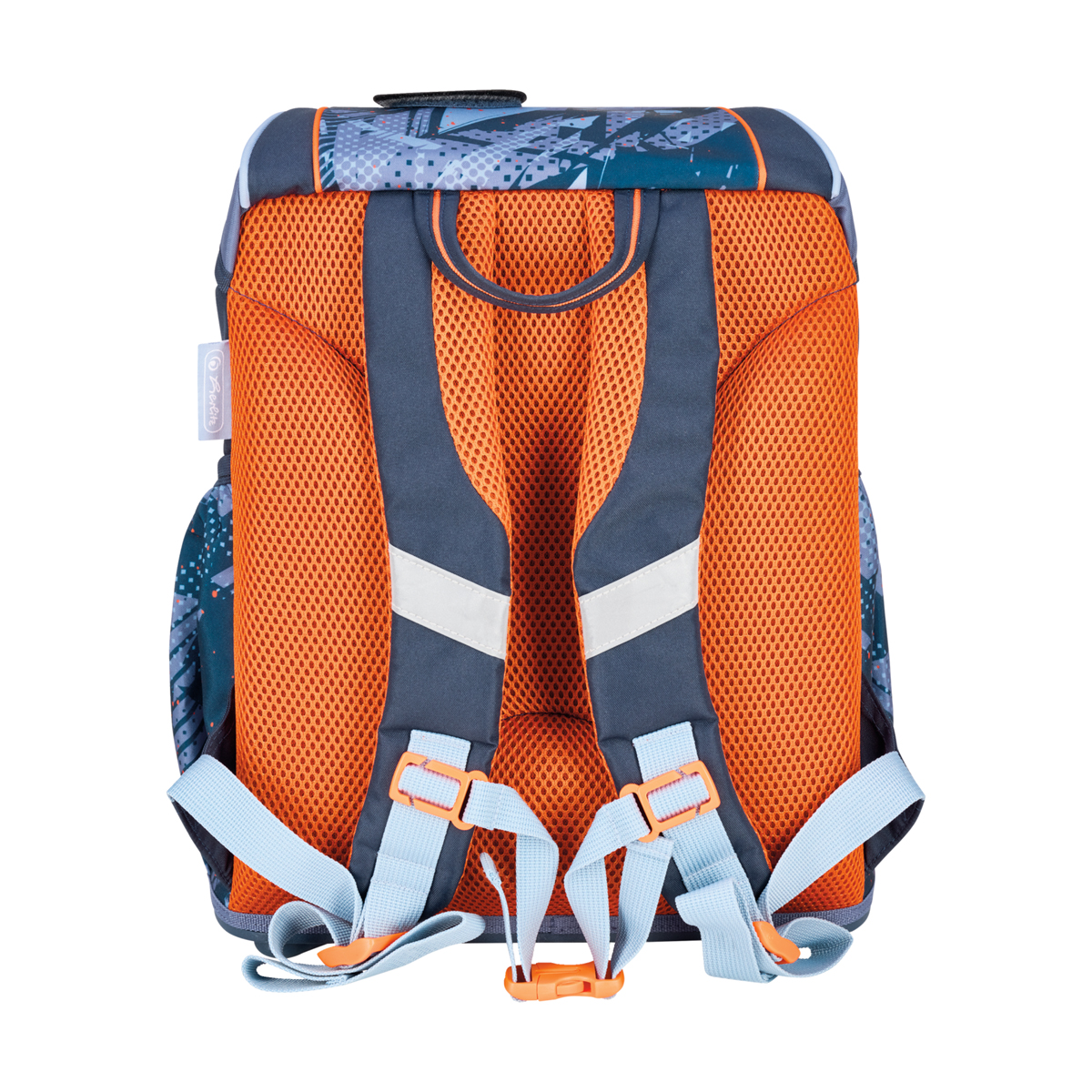 Školská taška s výbavou, s anatomicky tvarovaným polstrovaným a priedušným chrbtom, nastaviteľnými ramennými popruhmi, predným vreckom na zips, dvomi bočnými vreckami s elastickými pásikmi, stabilnou spodná doskou s nožičkami, pohodlnou rukoväťou, reflexnými prvkami Oralite, zatváranie Click lock zips, 1 x odnímateľný odznačik na suchý zips, 1 x dekoratívny prvok. Hmotnosť 800 g, objem 22 l, rozmery: 39 x 32 x 25 cm. Vode-odolná, bez PVC, výbava: peračník prázdny 2 chlopne, vrecko na prezuvky, oválne puzdro.