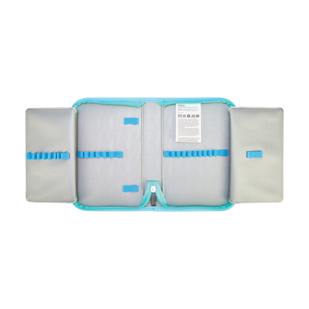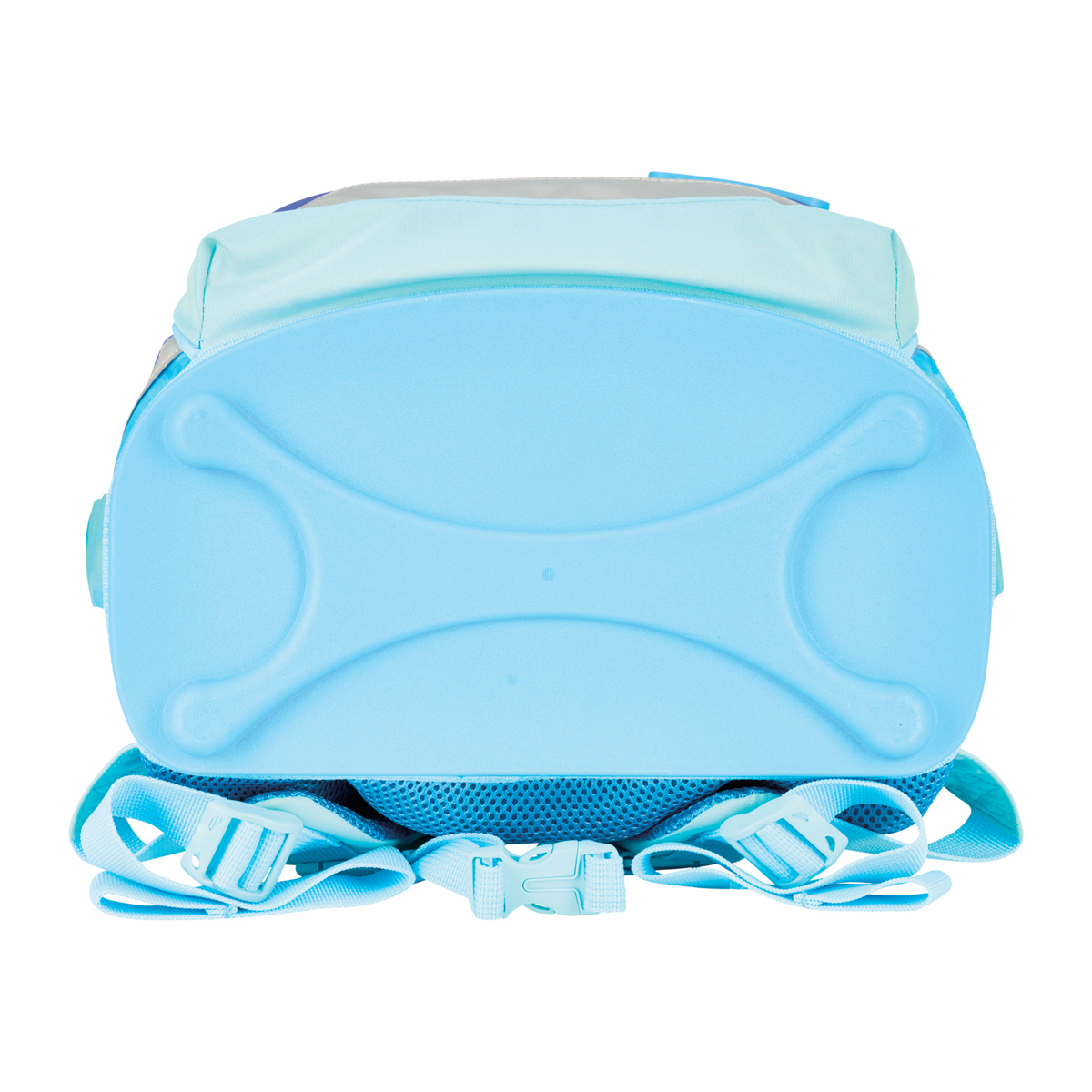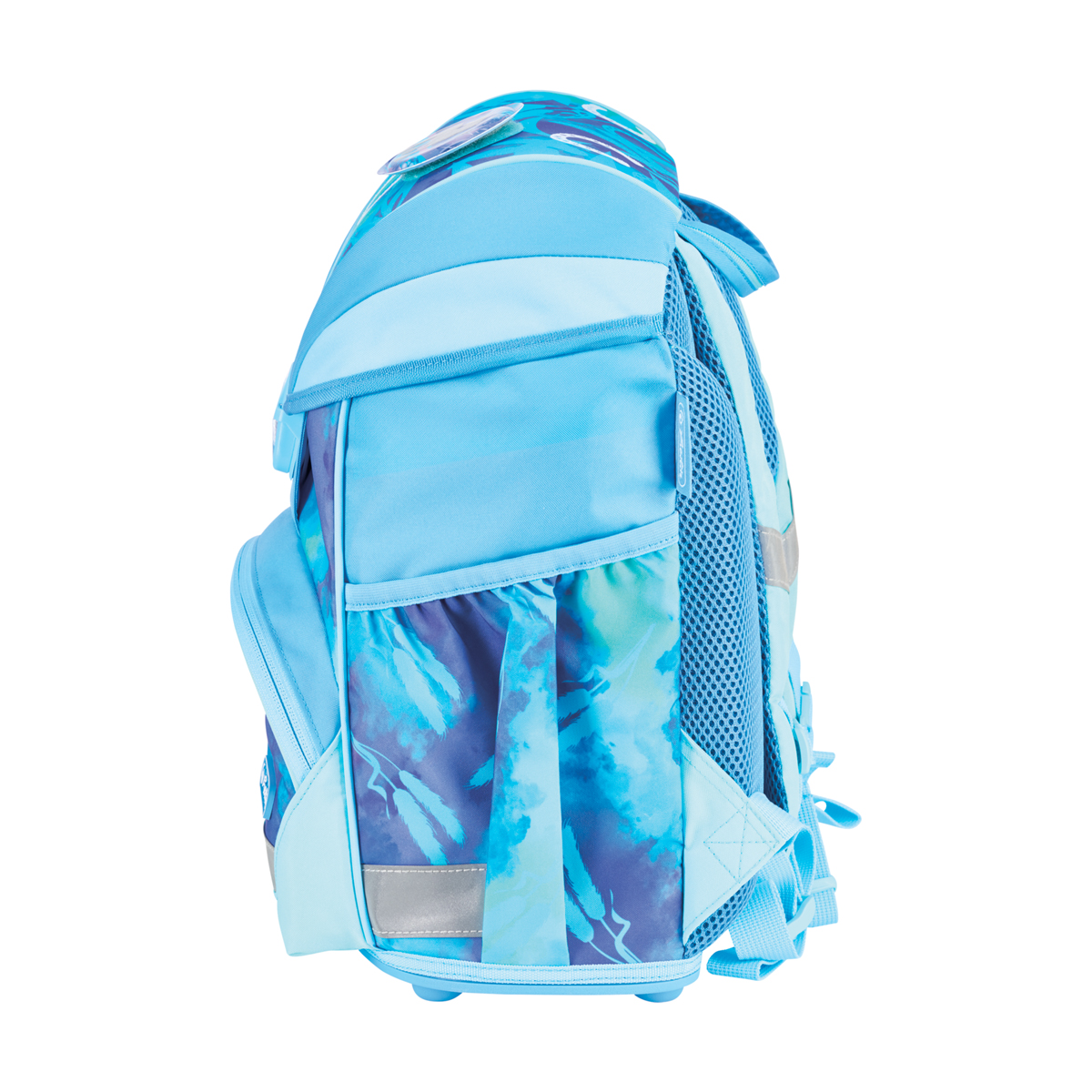 Školská taška s výbavou, s anatomicky tvarovaným polstrovaným a priedušným chrbtom, nastaviteľnými ramennými popruhmi, predným vreckom na zips, dvomi bočnými vreckami s elastickými pásikmi, stabilnou spodná doskou s nožičkami, pohodlnou rukoväťou, reflexnými prvkami Oralite, zatváranie Click lock zips, 1 x odnímateľný odznačik na suchý zips, 1 x dekoratívny prvok. Hmotnosť 800 g, objem 22 l, rozmery: 39 x 32 x 25 cm. Vode-odolná, bez PVC, výbava: peračník prázdny 2 chlopne, vrecko na prezuvky, oválne puzdro.