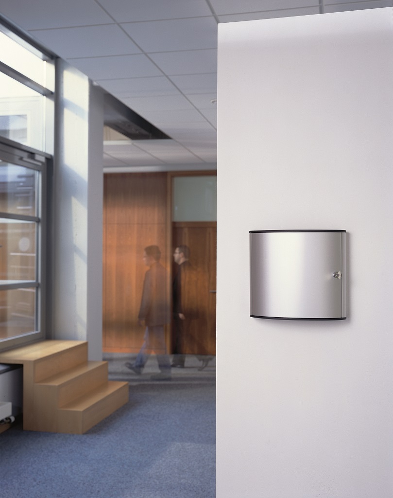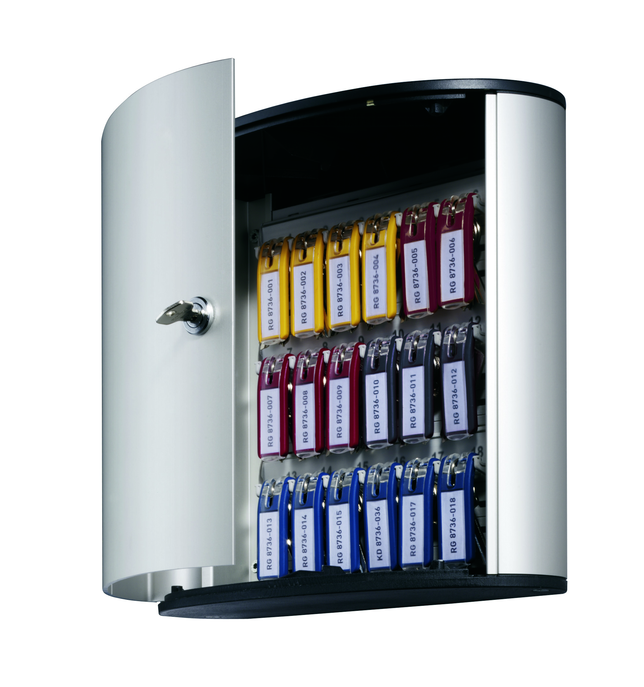 Skrinka na 18 kľúčov s dvierkami, otvárajúcimi sa z dôvodu lepšej obsluhy v 180° uhle. Jednoduchá montáž na stenu. Súčasťou balenia je montážna sada, 2 bezpečnostné kľúče a 6 menoviek na kľúče v rôznych farbách. Farba strieborná.