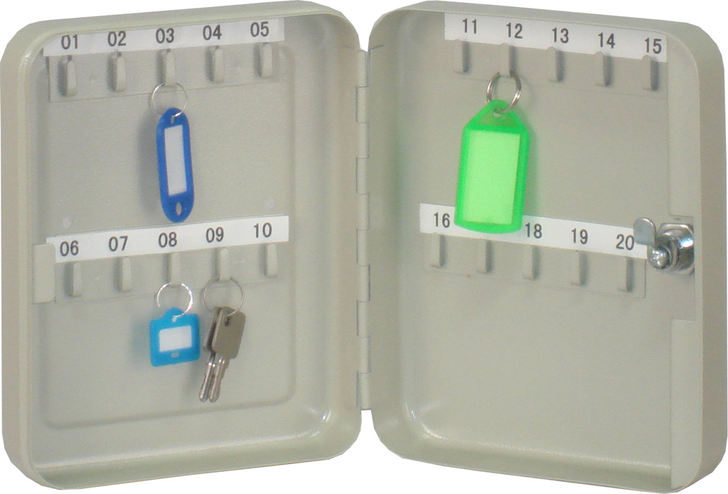 Uzamykateľná skrinka na 20 kľúčov, vyrobená z pevnej ocele. Súčasťou balenia sú 2 kľúče. Farba sivá. Rozmery 160 × 200 × 60 mm.