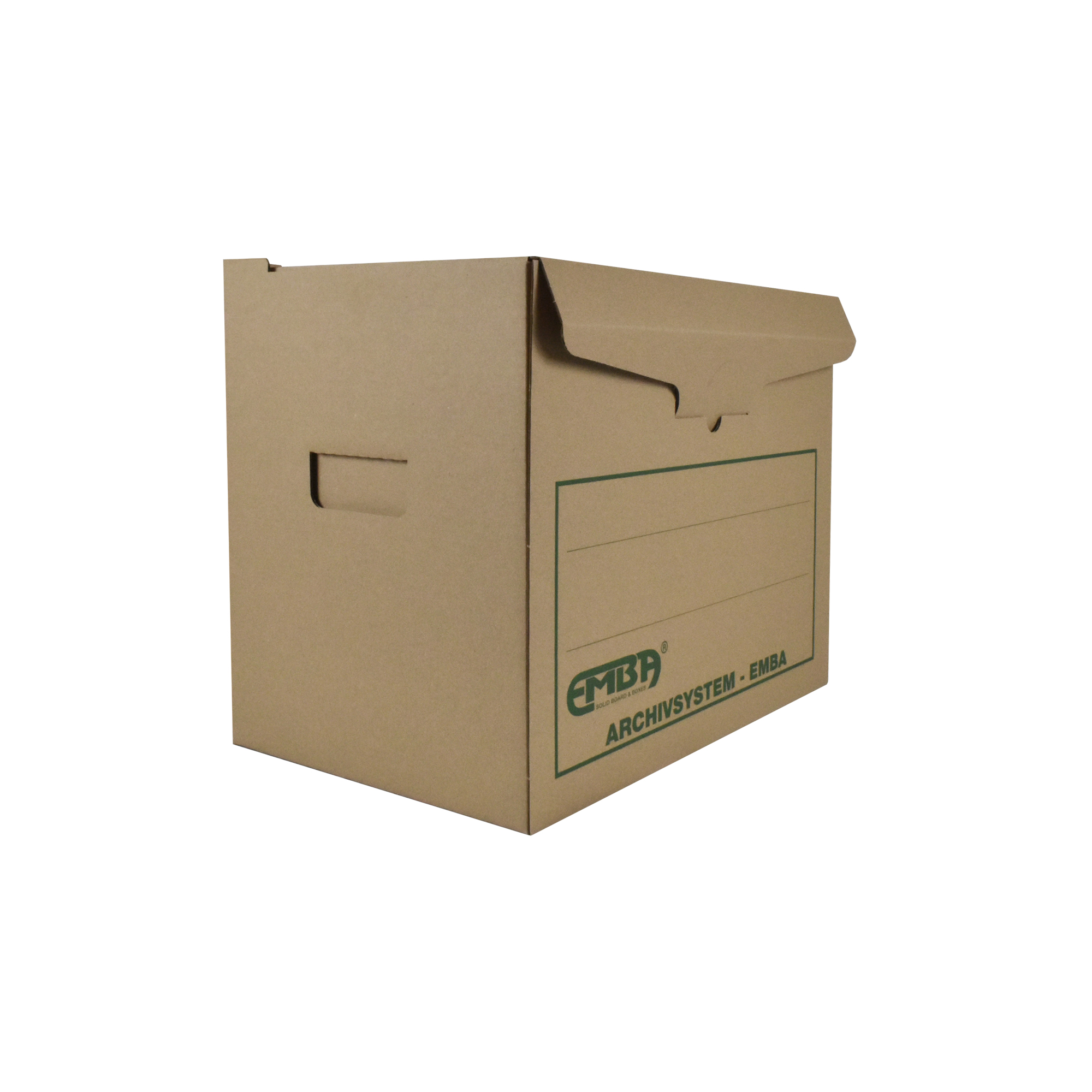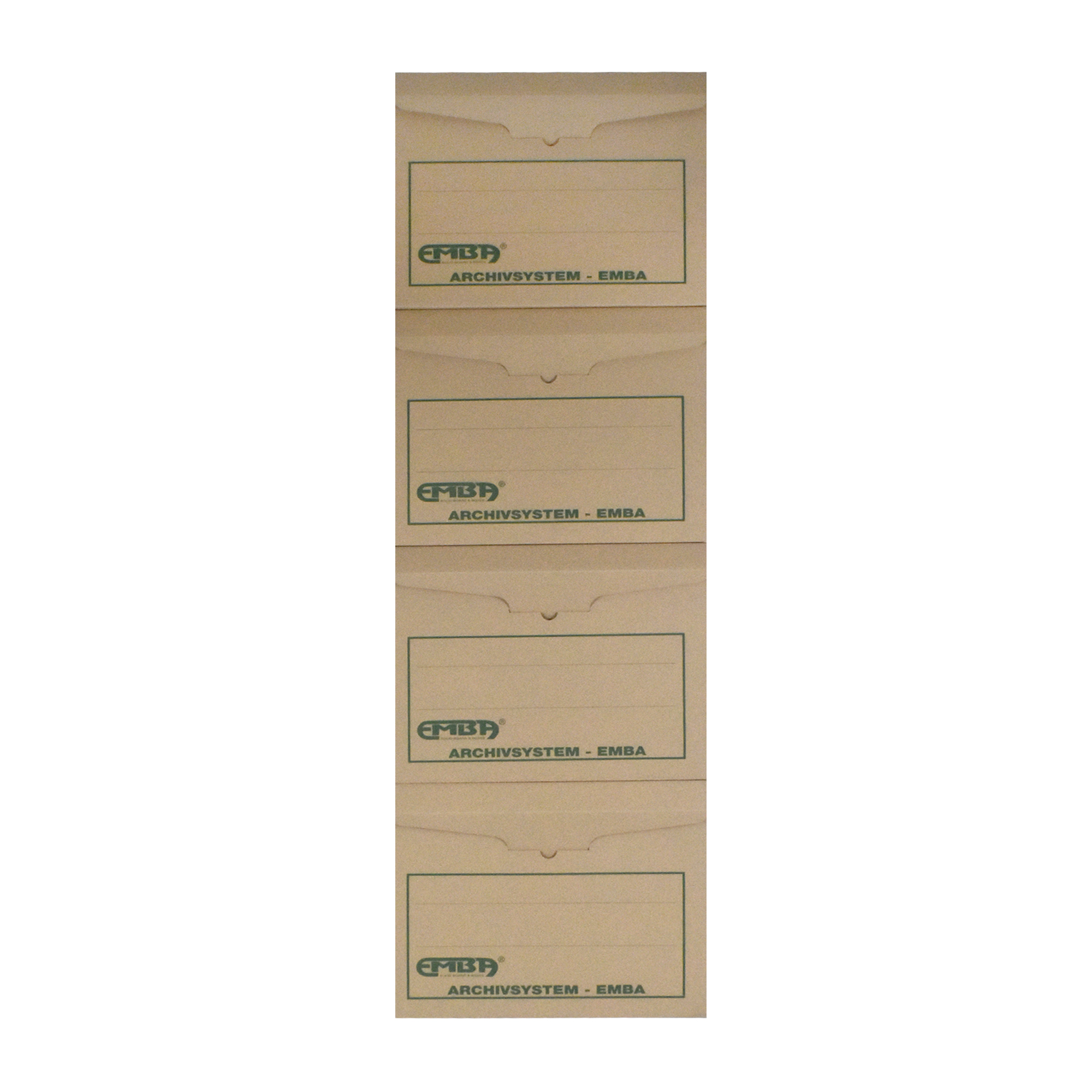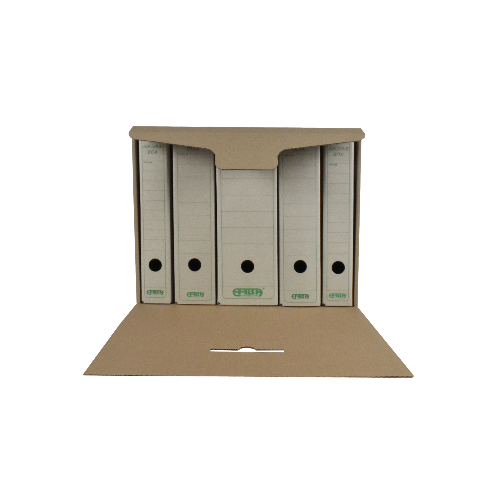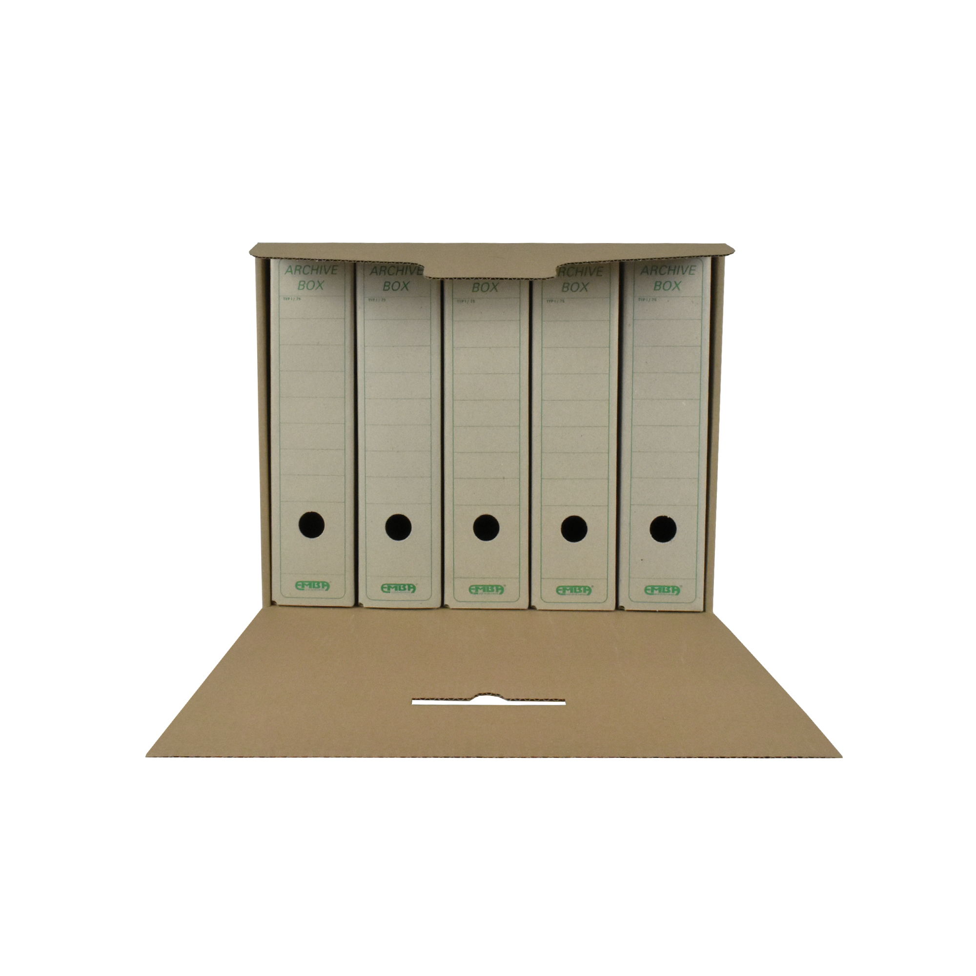 Skupinový box EMBA – uzatvárateľný box s prehľadným popisovaním a zosilnenými stenami s možnosťou ukladania až 4 boxov na seba. Kapacita 5 archívnych boxov EMBA I/-75, resp. kombinácia 2 ks I/-50, 2 ks I/-75 a 1 ks I/-110. Nevhodný na archiváciu zakladačov. Vyrobený z kvalitnej trojvrstvovej vlnitej lepenky H/-H so zelenou potlačou. Dodávaný v rozloženom stave. Farba prírodná hnedá. Rozmery (š x v x d) 400 x 335 x 265 mm.