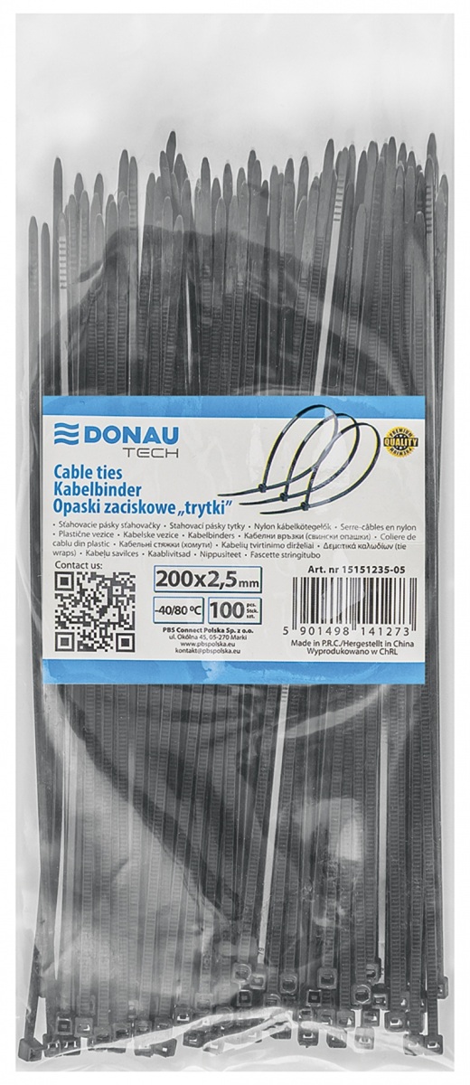 Sťahovacia páska na káble DONAU TECH 200×2.5mm, 100ks, čierna