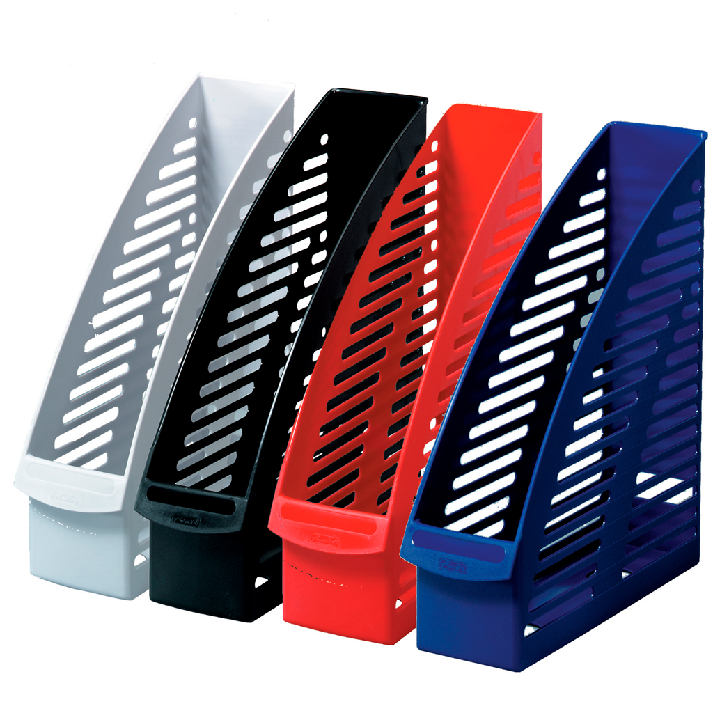 Plastový stojan na časopisy zaoblený dizajn – odolný materiál, miesto na etiketu na chrbte. Farba červená.