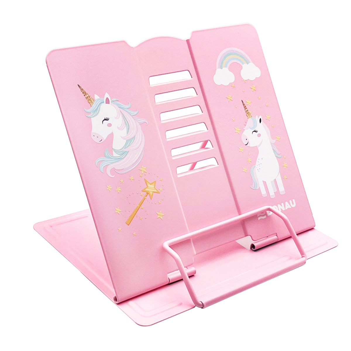 Kvalitný stojan na knihy, učebnice alebo tablet s atraktívnou potlačou Jednorožec. Vyrobený z odolného lakovaného kovu, ideálny aj pre ťažšie knihy. S protišmykovými úchytmi, nastaviteľná výška a uhol sklonu v 5 stupňoch. Keď sa nepoužíva, zloží sa úplne naplocho. Súčasťou je aj praktická zarážka na otvorenú stránku. Využitie nájde doma, v škole, v kuchyni, v kancelárii či ako stojan na noty. Rozmery: základňa: 21 × 16,5 cm, výška: 15,7 cm.