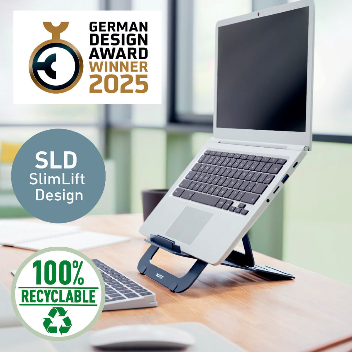 Ergonomicky navrhnutý ultra plochý hliníkový stojan na notebook zdvihne obrazovku notebooku do ergonomického a pohodlného pozorovacieho uhla poskytuje odolnosť a stabilitu pre notebooky do veľkosti 15 palcov alebo tabletu. Mimoriadne elegantný stojan na notebook s dizajnom SlimLift (SLD) ľahko vkĺzne do tašky a optimalizuje váš pracovný priestor, nech ste kdekoľvek. Vrátane tašky na prenášanie.