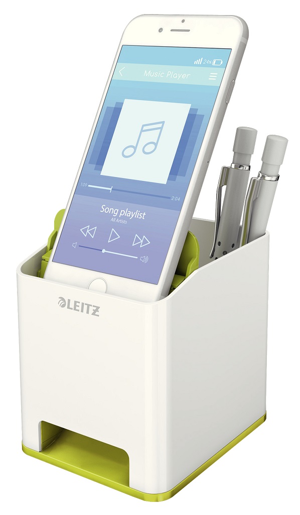 Neprehliadnuteľný štýlový stojan na perá v prémiovej kvalite Leitz v štýlových žiarivých farbách WOW. Extra odkladač pre smartphone do veľkosti iPhone 6 plus so špeciálnou funkciou pre zosilovanie zvuku, veľa miesta pre písacie potreby, pravítko, stylus a iné drobnosti. Moderný dizajn, ktorý vyzerá rovnako dobre v kancelárii, ako aj doma na pracovnom stole, dobre dopĺňa ostatné produkty radu WOW.