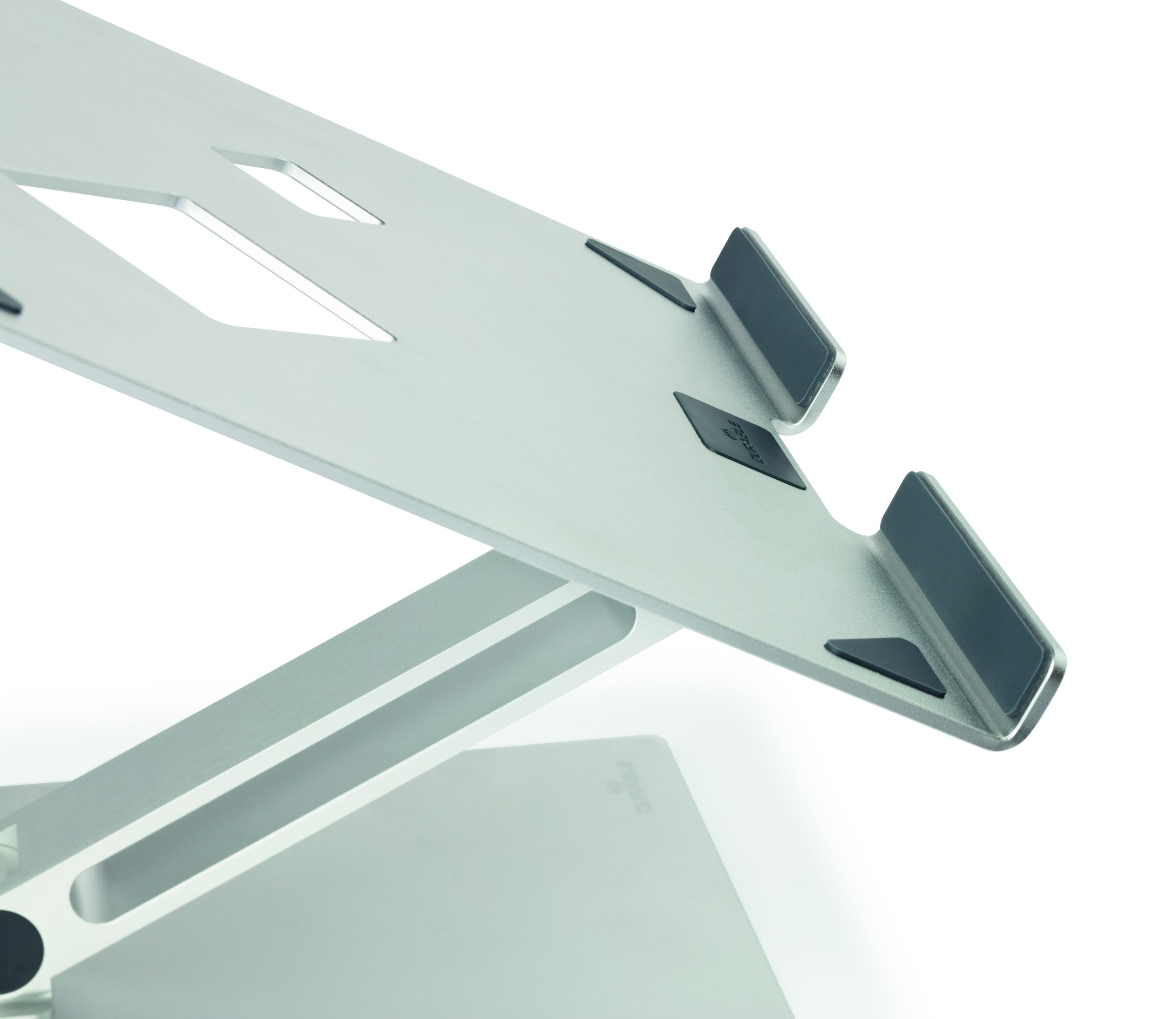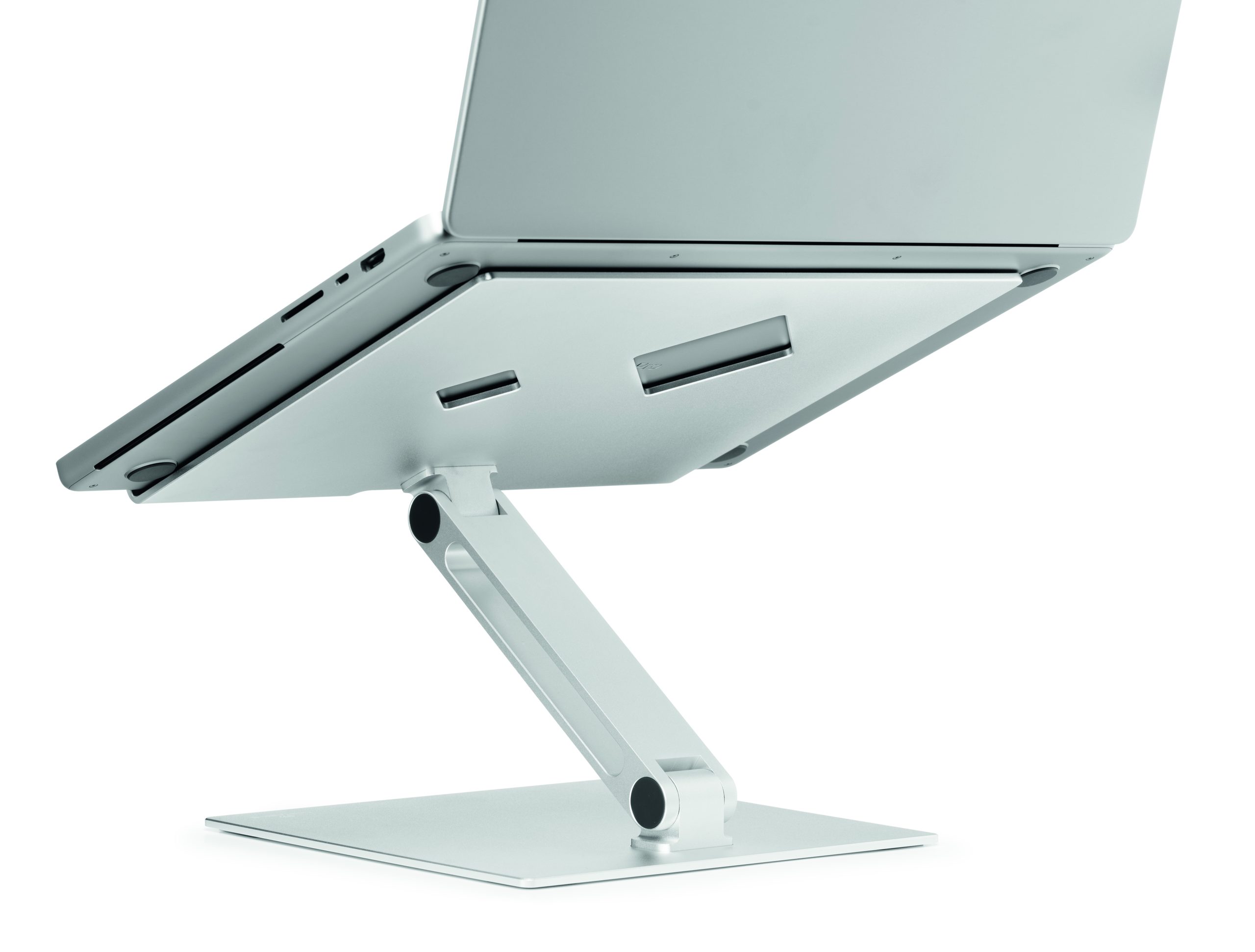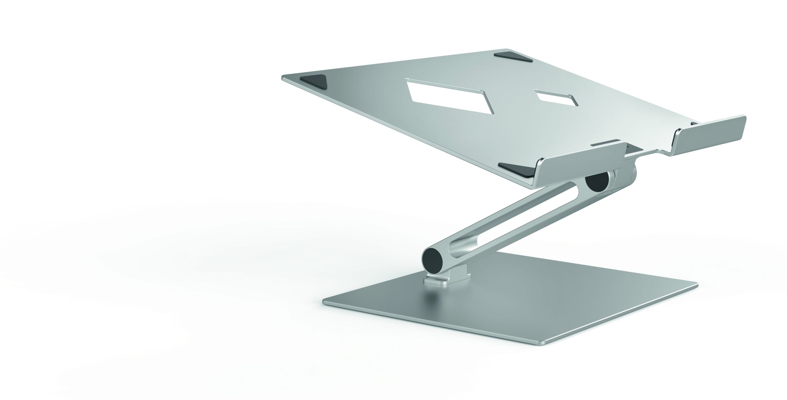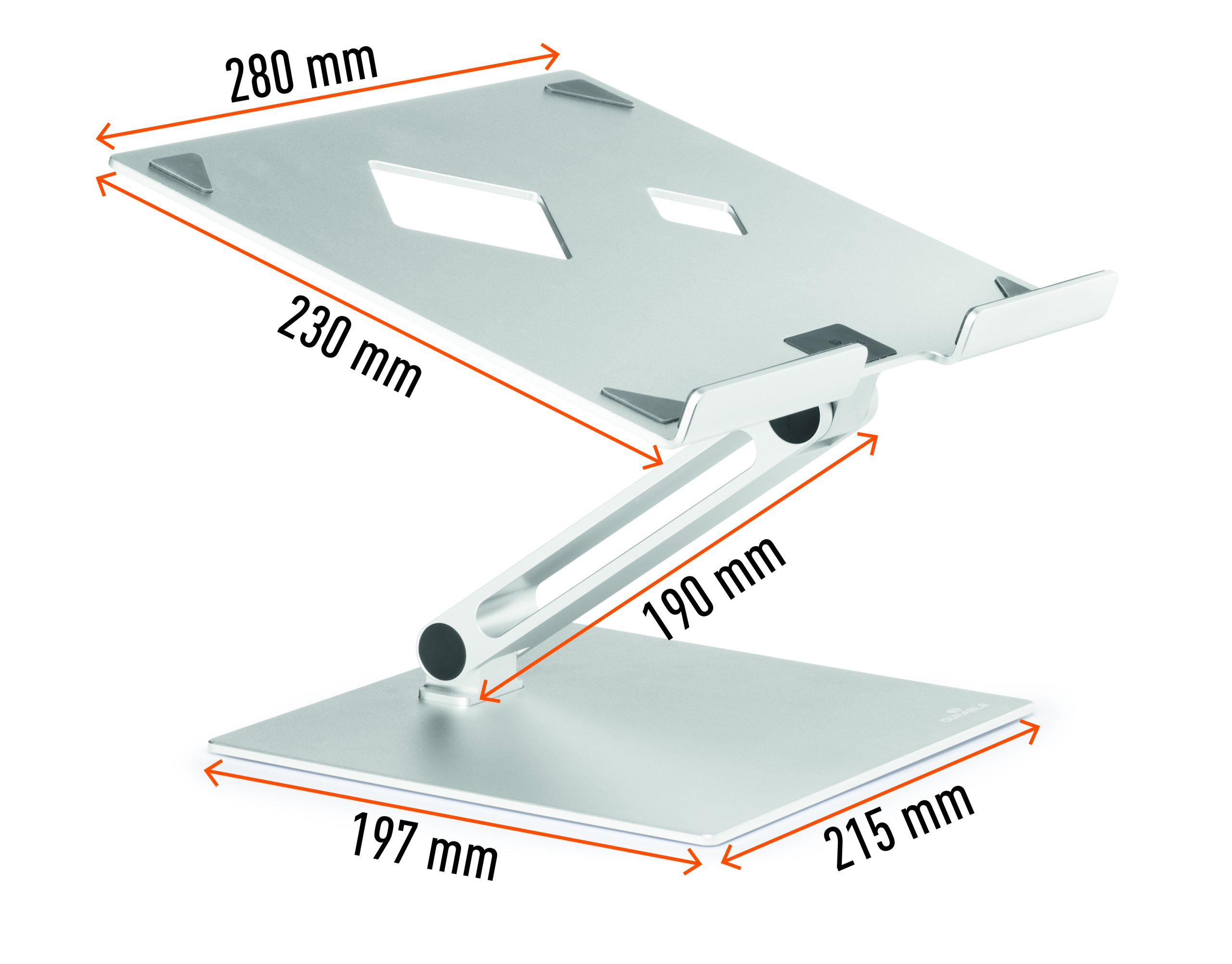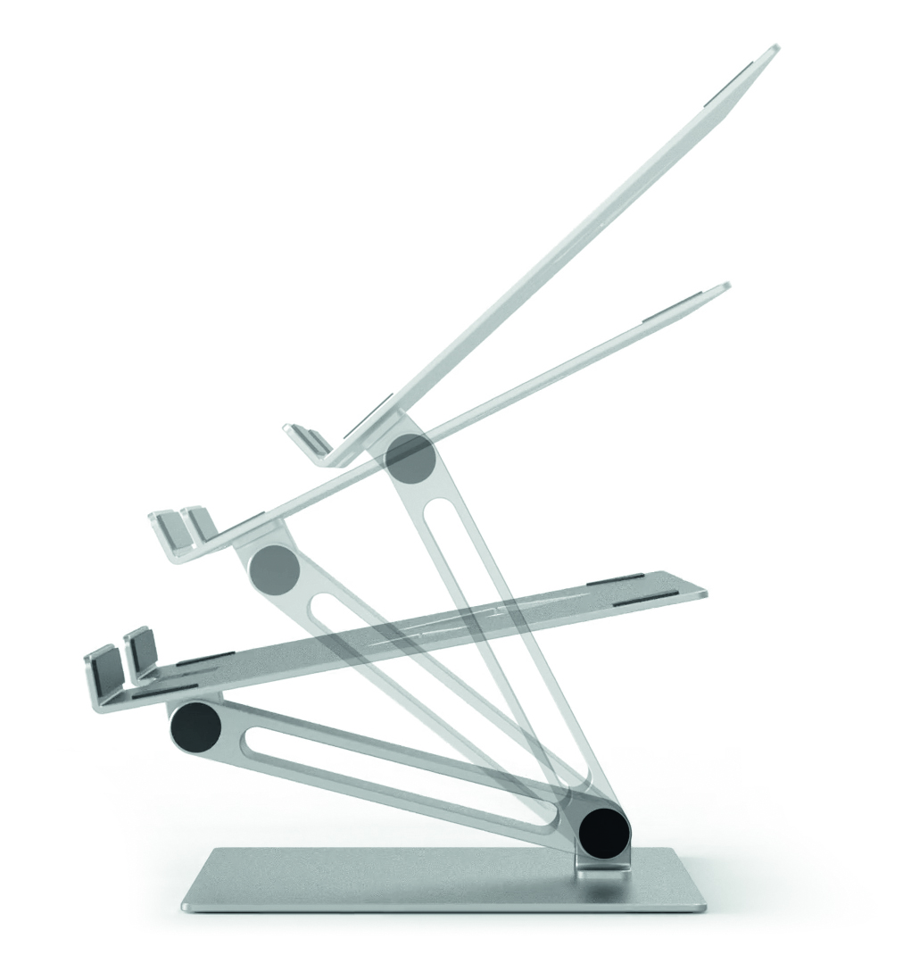 Univerzálny nastaviteľný stojan na stôl pre notebooky a tablety od 10” do 17”. Uľahčuje prácu vďaka ergonomickej a flexibilnej nastaviteľnosti výšky a uhla sklonu. Umožňuje používanie notebookov ako stolových monitorov (v kombinácii s externou klávesnicou a myšou). Vysoko stabilný pre bezpečnú prácu. Protišmykový gumený povrch chráni zariadenie pred poškriabaním. Mimoriadne robustný.