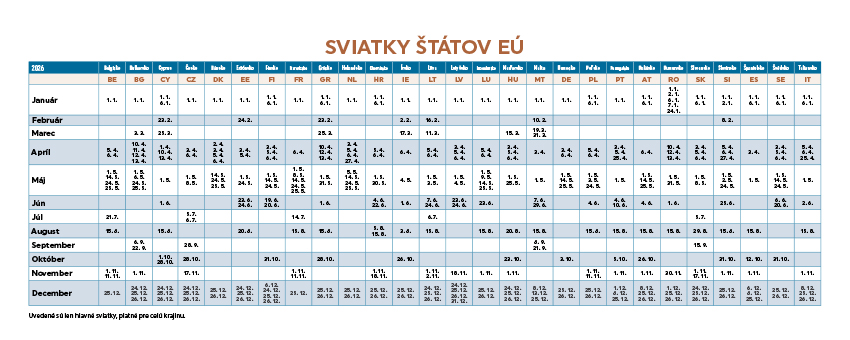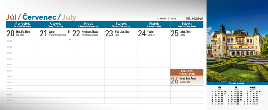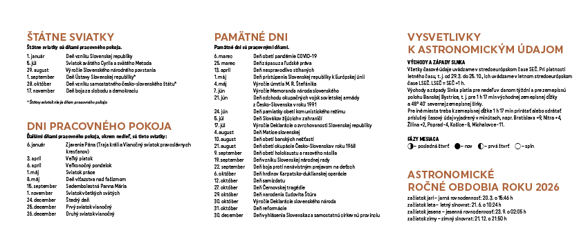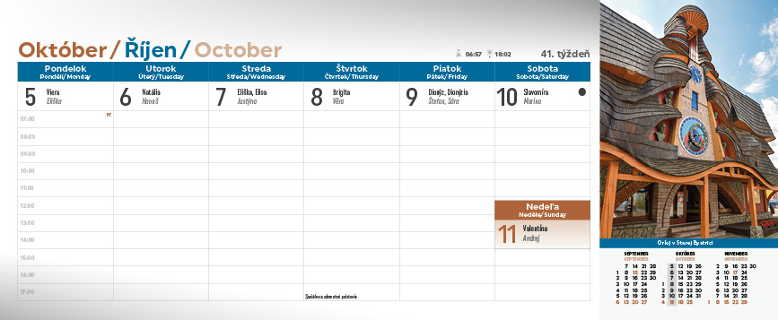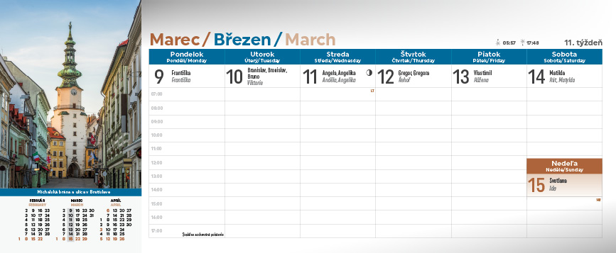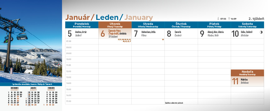 Spoznajte krásy Slovenska prostredníctvom stolového kalendára Slovensko. Týždňový stĺpcový kalendár s hodinovým delením, daňovými pripomienkami, fázami Mesiaca, východmi a západmi Slnka, štátnymi sviatkami všetkých krajín EÚ, školskými prázdninami, slovenskými a českými menami (plus netradičné mená).