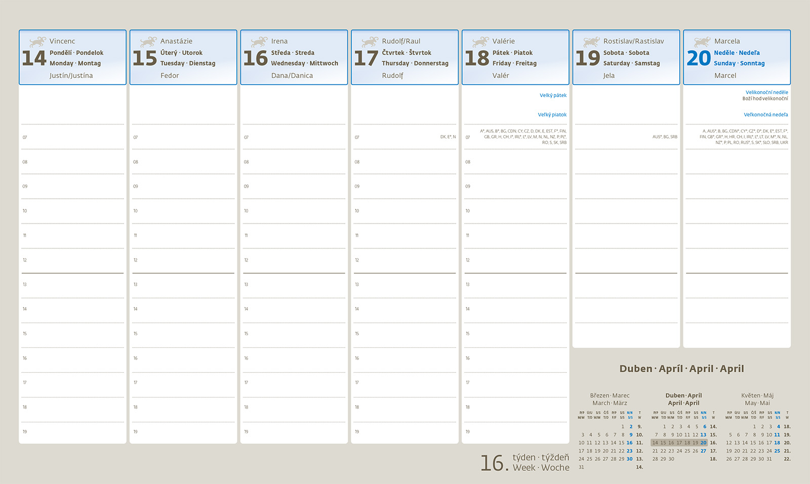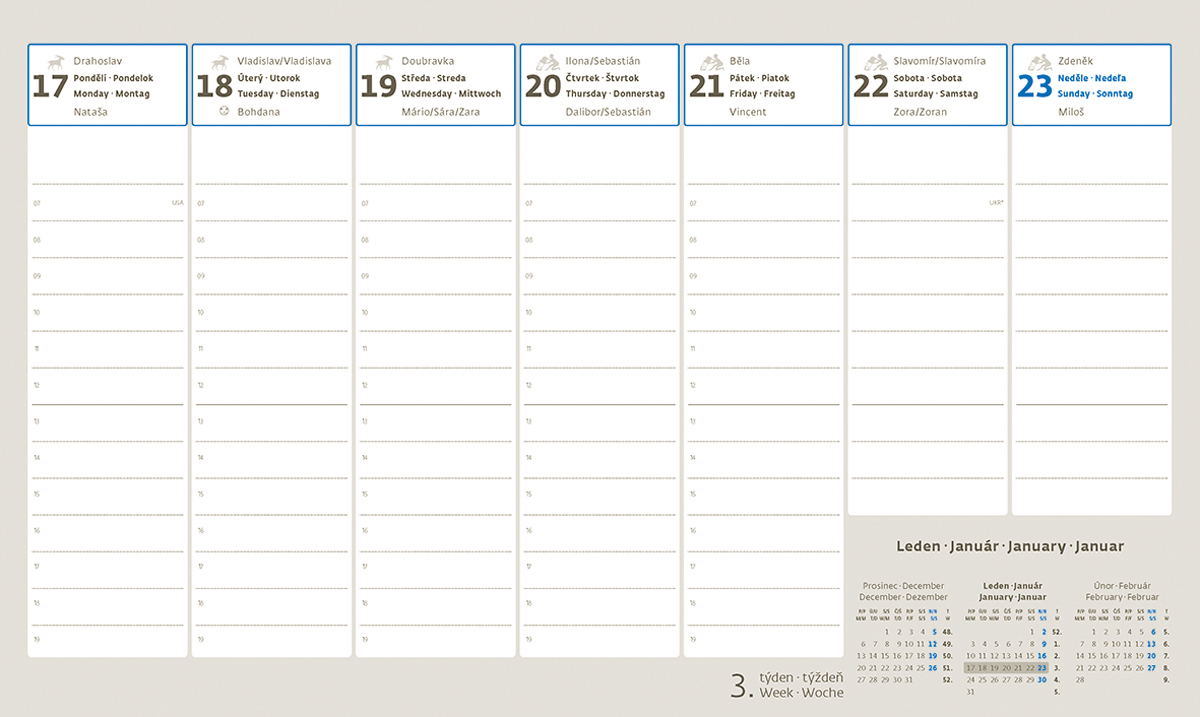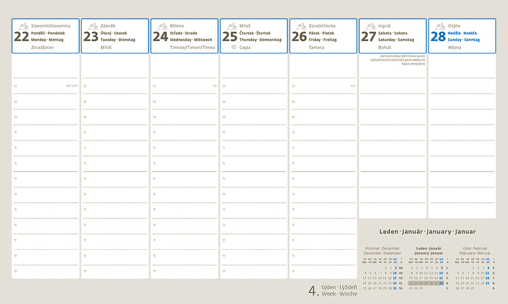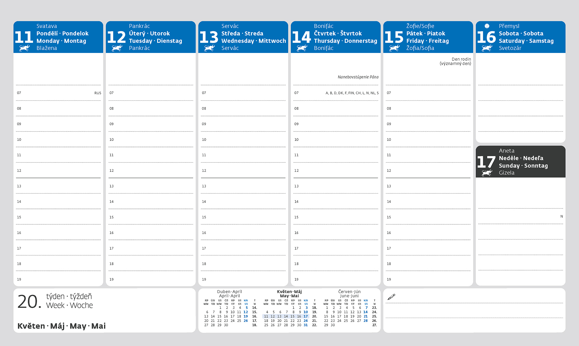 Kalendárium: české/slovenské týždenné stĺpcové + AJ + NJ