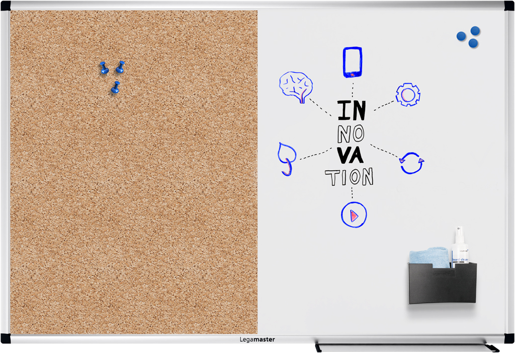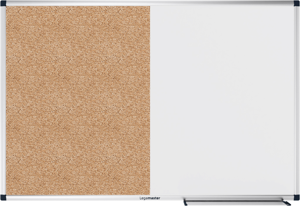 Kombinácia korkovej nástenky a bielej tabule v jednom ráme na príležitostné použitie v kancelárii alebo domácej kancelárii. Jedna polovica: Magnetická lakovaná oceľová tabuľa vhodná na popisovanie za sucha stierateľnými popisovačmi na tabuľu. Druhá polovica: Nástenka s povrchom z prírodného korku. Hliníkový rám so sivými plastovými rohovými krytkami (Pantone