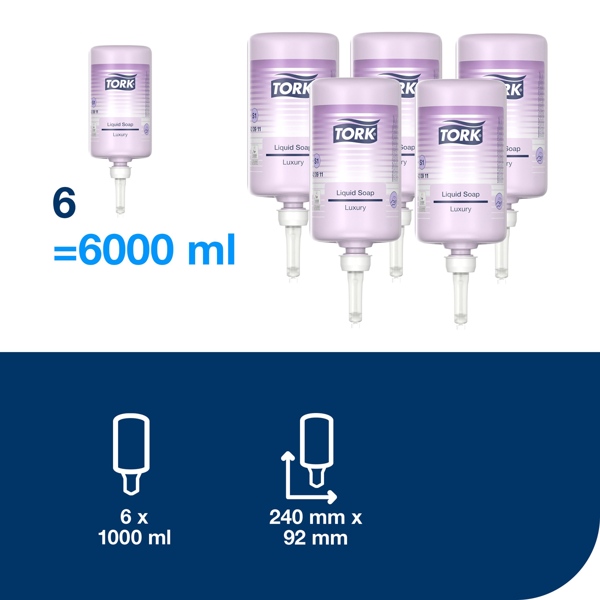 Jednorazová náplň luxusného tekutého mydla vhodná do dávkovačov TORK, ktoré sú overené ako ľahko používateľné a všetkým užívateľom poskytujú správnu hygienu rúk. Doprajte návšteve sviežu jazmínovú vôňu Tork. Výnimočné zloženie s jedinečnou vôňou a bohatými odtieňmi orgovánu obsahuje tiež výťažok z hodvábu, ktorý zanechá na vašej pokožke pocit jemnosti. Luxusná jazmínová vôňa, obsahuje 1 000 dávok. Objem 1000 ml.