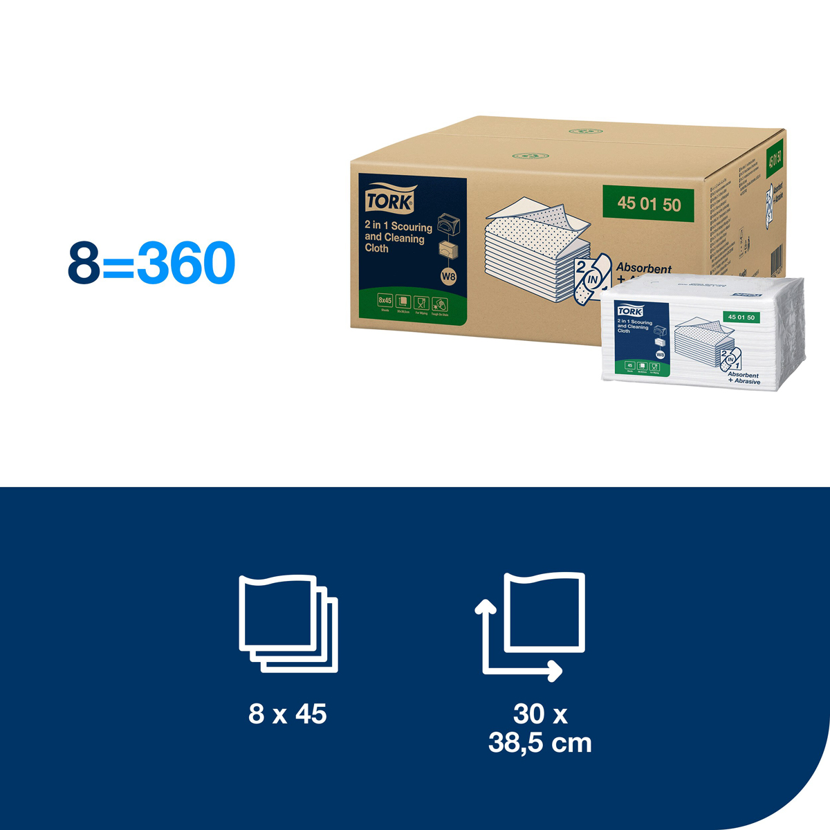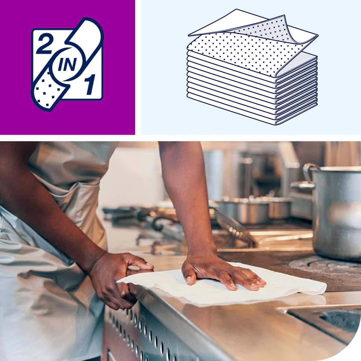 Tork utierky 2 v 1 na drhnutie a čistenie sú abrazívne a absorpčné utierky určené na efektívne upratovanie. Pri čistení odolných nečistôt, napríklad v kuchynskom prostredí, nepoškriabu žiadny povrch. Utierky môžete opláchnuť a znova použiť a sú kompatibilné s bežnými čistiacimi prostriedkami.