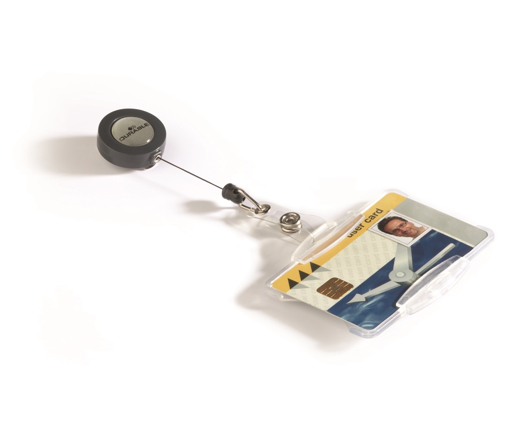 Plastová visačka na jednu plastovú identifikačnú kartu z priehľadného pružného plastu vysokej kvality, z prednej strany otvorená. Vhodná na ochranu magnetických a bezpečnostných kariet pred poškodením. Uchytenie klipu na kratšej alebo dlhšej strane poskytuje univerzalitu pri použití horizontálne alebo vertikálne označených kariet. Výsuvný kotúčik čiernej farby s kovovým klipom s možnosťou vysunutia do 80 cm. Balenie 10 ks.
