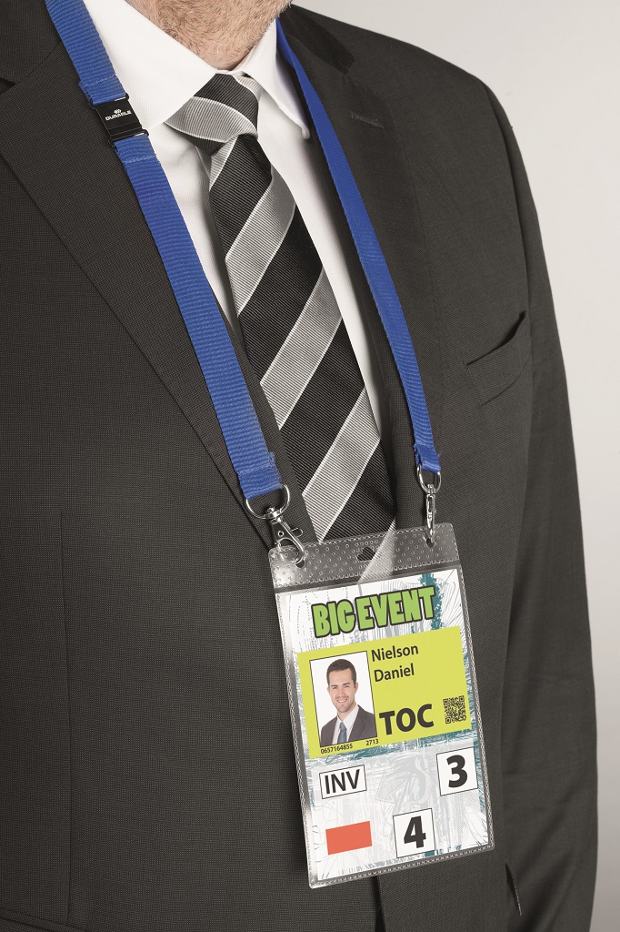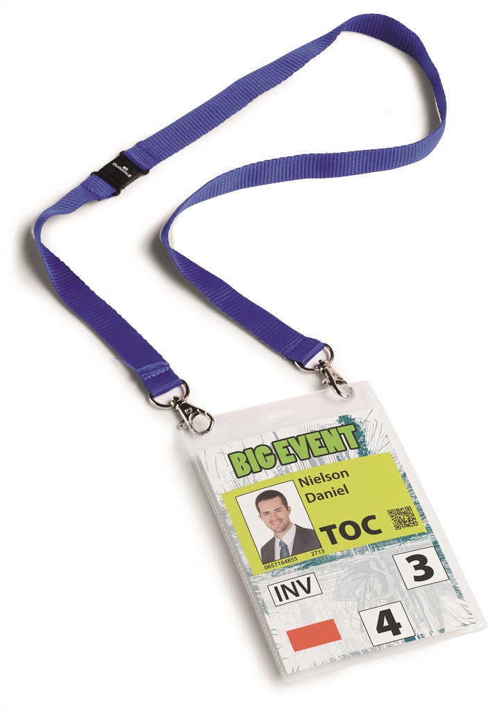 Visačka z PP s perforáciou na uchytenie a textilným remienkom šírky 20 mm s 2 karabínkami. Ideálna na vybavenie väčšieho počtu osôb na konferenciách, výstavách a pod. Dodávaná s etiketou formátu A6. Remienok modrý.