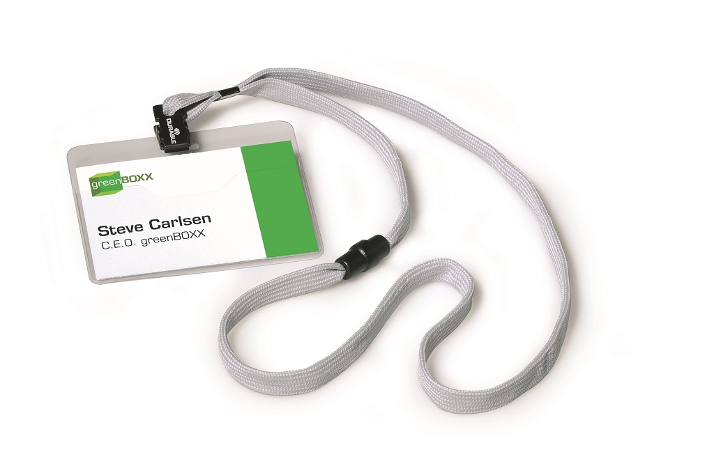Visačka na krk s farebným bezpečnostným remienkom dĺžky 44 cm. Poistka na remienku sa uvoľní pri zachytení remienka alebo silnom potiahnutí. Materiál pevné priehľadné PVC, závesný remienok šírky 10 mm. Balenie 10 ks. Náhradné papieriky DU145602.