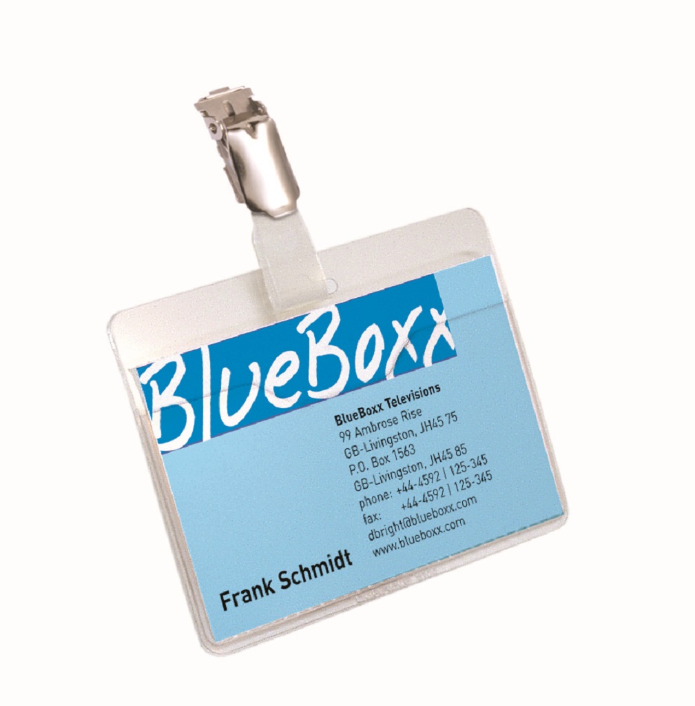Priehľadná visačka s európskym štipcom, umiestneným na dlhšej strane visačky. Dodávané s papierovými kartičkami rozmerov 90 × 60 mm. Model, pri ktorom možno menovku vyberať bez potreby odnímania štipca s remienkom. Farba transparentná. Balenie 5 ks.
