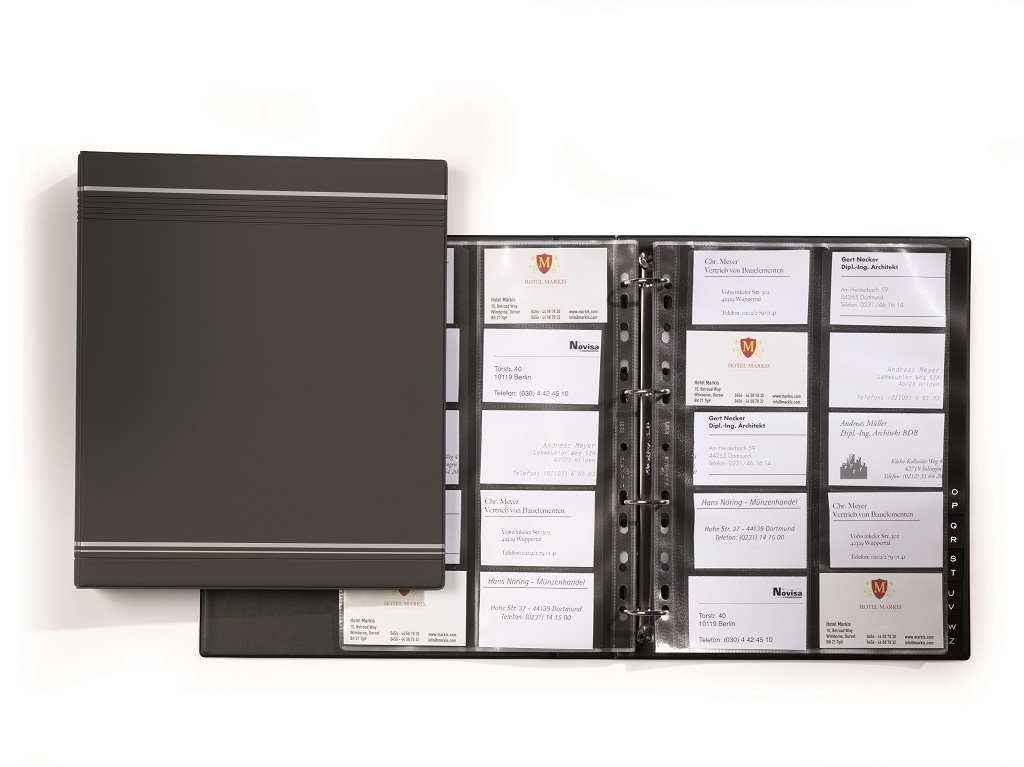 Exkluzívny zakladač na vizitky v úprave matné PVC so 4-krúžkovou mechanikou. 25 obalov z polypropylénu, 12 čiernych rozlišovačov A—Z. V dizajne Visifix s dekoratívnymi prúžkami. Formát A4. Možnosť rozšírenia náhradnými obalmi obj. kód DU2389 19.( V balení 10 ks náhradných obalov.)