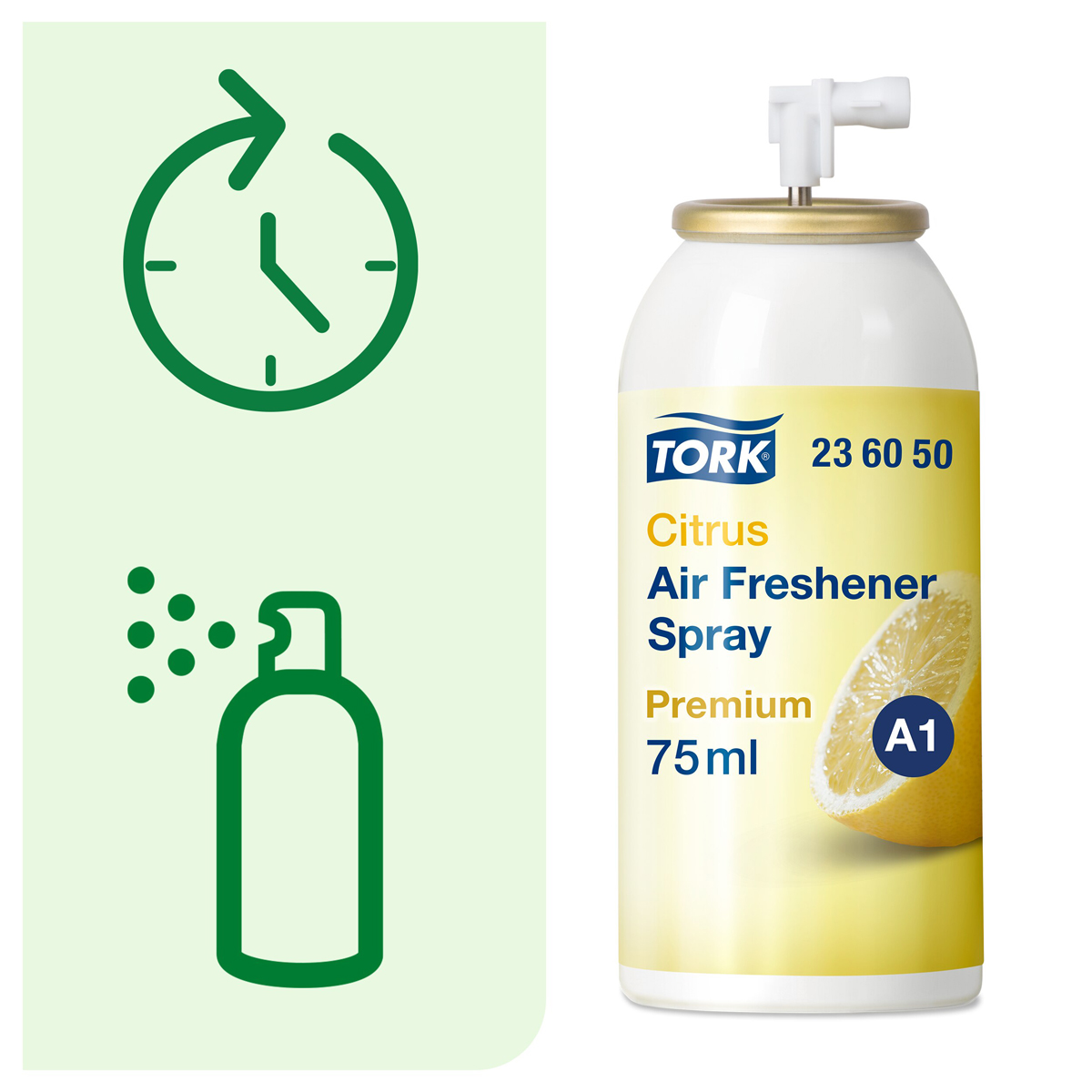 Náplň do elektronického osviežovača vzduchu TORK. Vôňu vo vašej toalete a umyvárni môžete dôkladne a efektívne kontrolovať. Sprej obsahuje vonné oleje a patentovanú zložku neutralizujúcu nepríjemné zápachy a zároveň poskytuje dlhotrvajúci pocit čerstvého vzduchu. Správna vôňa vyvinutá popredným európskym parfumérom.