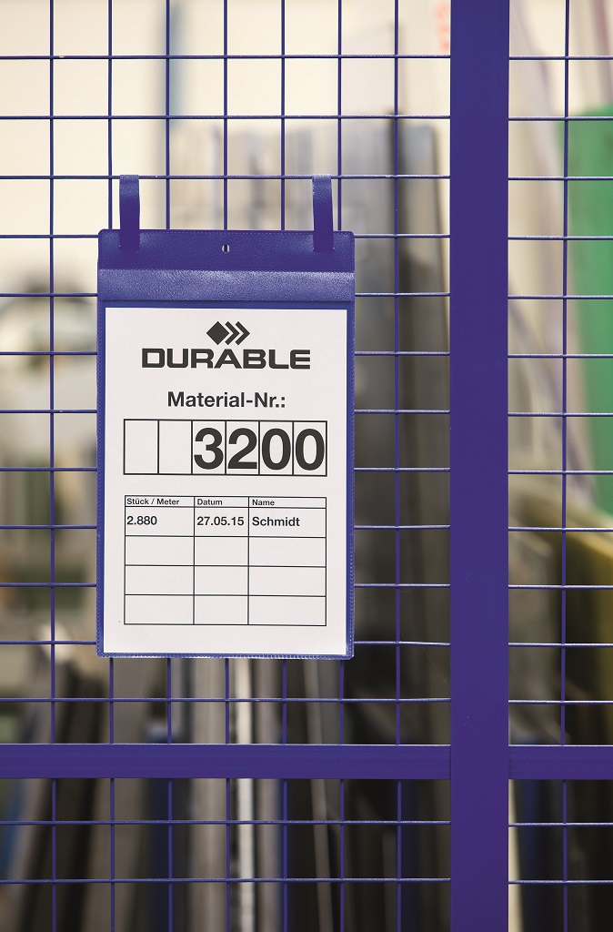 Plastové vrecká s priehľadnou prednou stranou a s 2 upínacími prúžkami s ochranou proti rozpojeniu sú vhodné na kovové povrchy, napr. sieťované kontajnery, rúry a prepravné kontajnery. Použiteľné aj v exteriéri vďaka ochrannej klope, chrániacej dokumenty proti dažďu, prachu a vlhku. Farba modrá. Formát A4 na výšku. Balenie 50 ks.