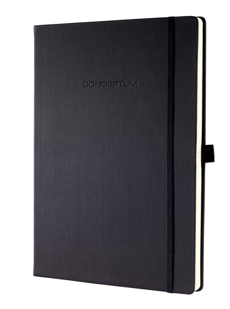 Zápisník s elastickou gumičkou, chrániacou pred nechceným otvorením. Pevná väzba s jemným ryhovaním. Čistý a jednoduchý dizajn až do posledného detailu. Moderný, elegantný, so zameraním na to podstatné. To je CONCEPTUM®, víťaz medzinárodnej ceny za dizajn. Nóbl sofi stikované zápisníky jedinečného štýlu, ktorý môžete vidieť aj cítiť, sú vhodné pre profesionálnu, ako aj pre osobnú potrebu. S citlivosťou volené materiály a vynikajúca kvalita sú skombinované so skutočnou eleganciou. Zápisníky sú vybavené osobným adresárom, uškom na pero, 2 lacetkami, vreckom na uchovanie materiálov s miestom na vizitku, k dispozícii je 20 perforovaných strán pre potreby vytrhnutia poznámok, strany v zápisníku sú číslované.Formát A4, úprava linajková. Počet strán 194. Farba čierna.