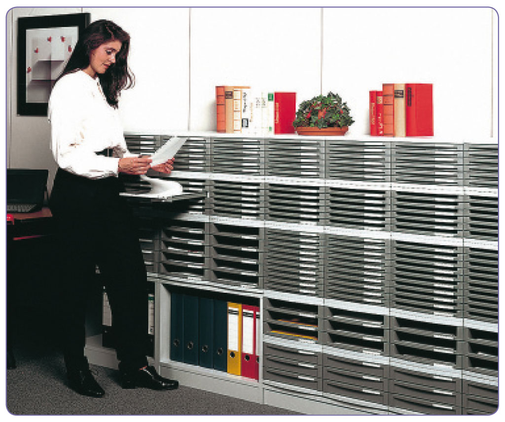 Box z modulárneho systému zásuvkových boxov s horizontálnym aj vertikálnym spájaním. Model so zatvorenými zásuvkami výšky 50 mm a zarážkou chrániacou zásuvky pred úplným vysunutím. Súčasťou sú identifikačné menovky na označenie zásuviek.Telo boxov vo svetlosivej farbe, zásuvky tmavosivé. Rozmery (š × v × h) 30 × 30,7 × 38,2 cm.
