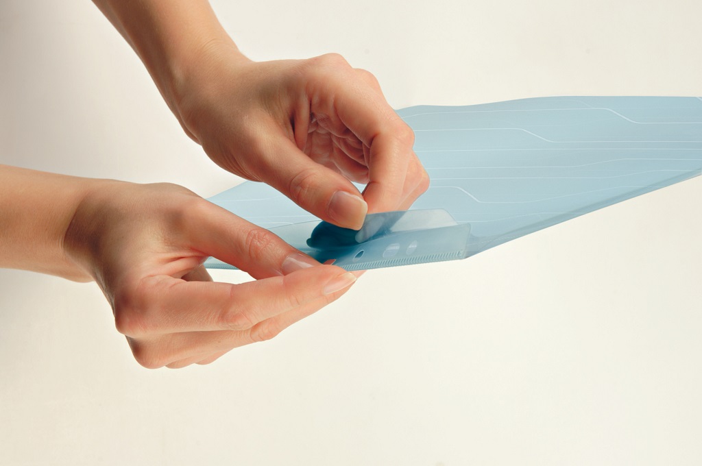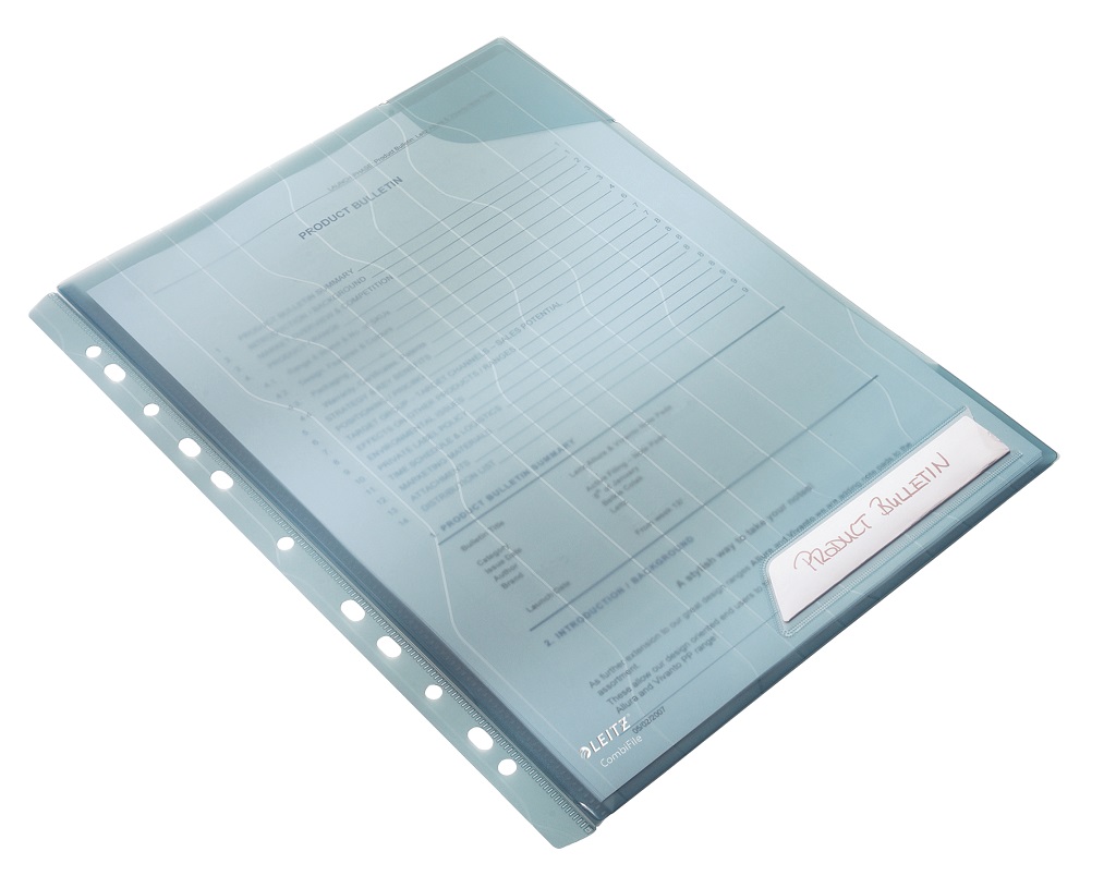 Unikátny závesný obal typu `L`, ktorý kombinuje vlastnosti euroobalov a obalov vďaka patentovanej skrývateľnej multiperforácii do špeciálneho puzdra. Obsahuje rohovú chlopňu, ktorá chráni vložený dokument a vrecko na popis obsahu s vymeniteľným štítkom. Vyrobený z kvalitného priehľadného PP s embosovaným vzorom. Hrúbka 200 um. Kapacita 40 listov papiera formátu A4. Balenie 5 ks.