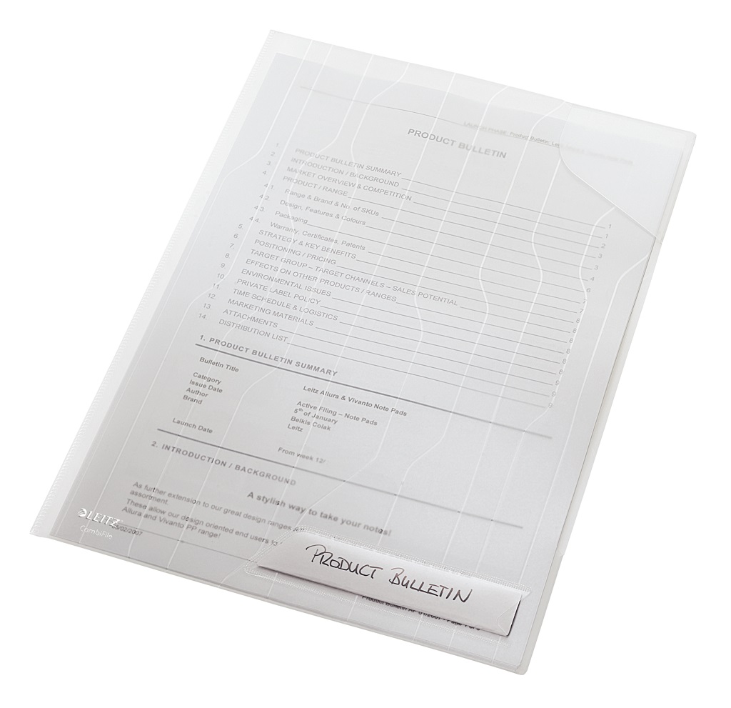 Unikátny závesný obal typu `L`, ktorý kombinuje vlastnosti euroobalov a obalov vďaka patentovanej skrývateľnej multiperforácii do špeciálneho puzdra. Obsahuje rohovú chlopňu, ktorá chráni vložený dokument a vrecko na popis obsahu s vymeniteľným štítkom. Vyrobený z kvalitného priehľadného PP s embosovaným vzorom. Hrúbka 200 um. Kapacita 40 listov papiera formátu A4.