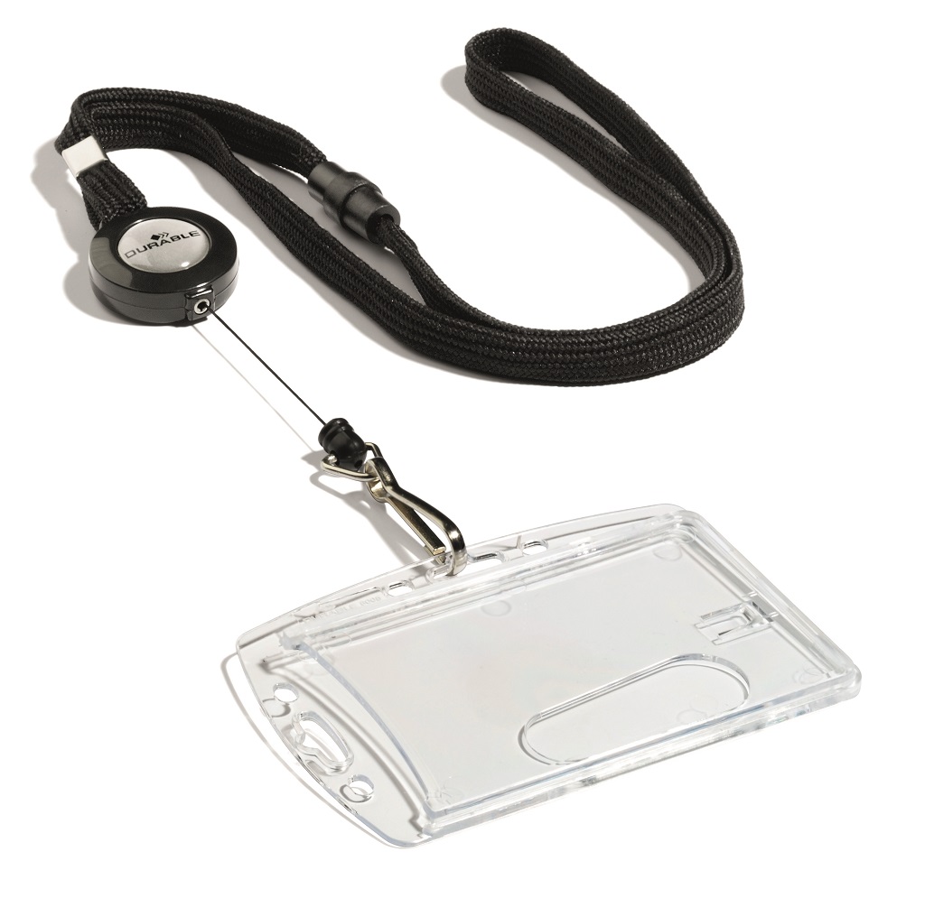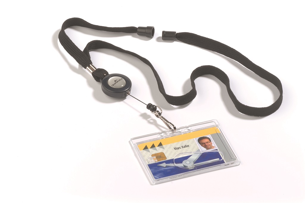 Kombinácia výsuvného kotúča a remienka na krk šírky 10 mm s bezpečnostnou poistkou, ktorá sa uvoľní pri zachytení remienka alebo pri silnom potiahnutí. Vďaka tomuto spôsobu uchytenia je možné s kartou pohodlne manipulovať. Vysunutie kotúča do 80 cm, remienok dĺžky 44 cm. Balenie 10 ks.