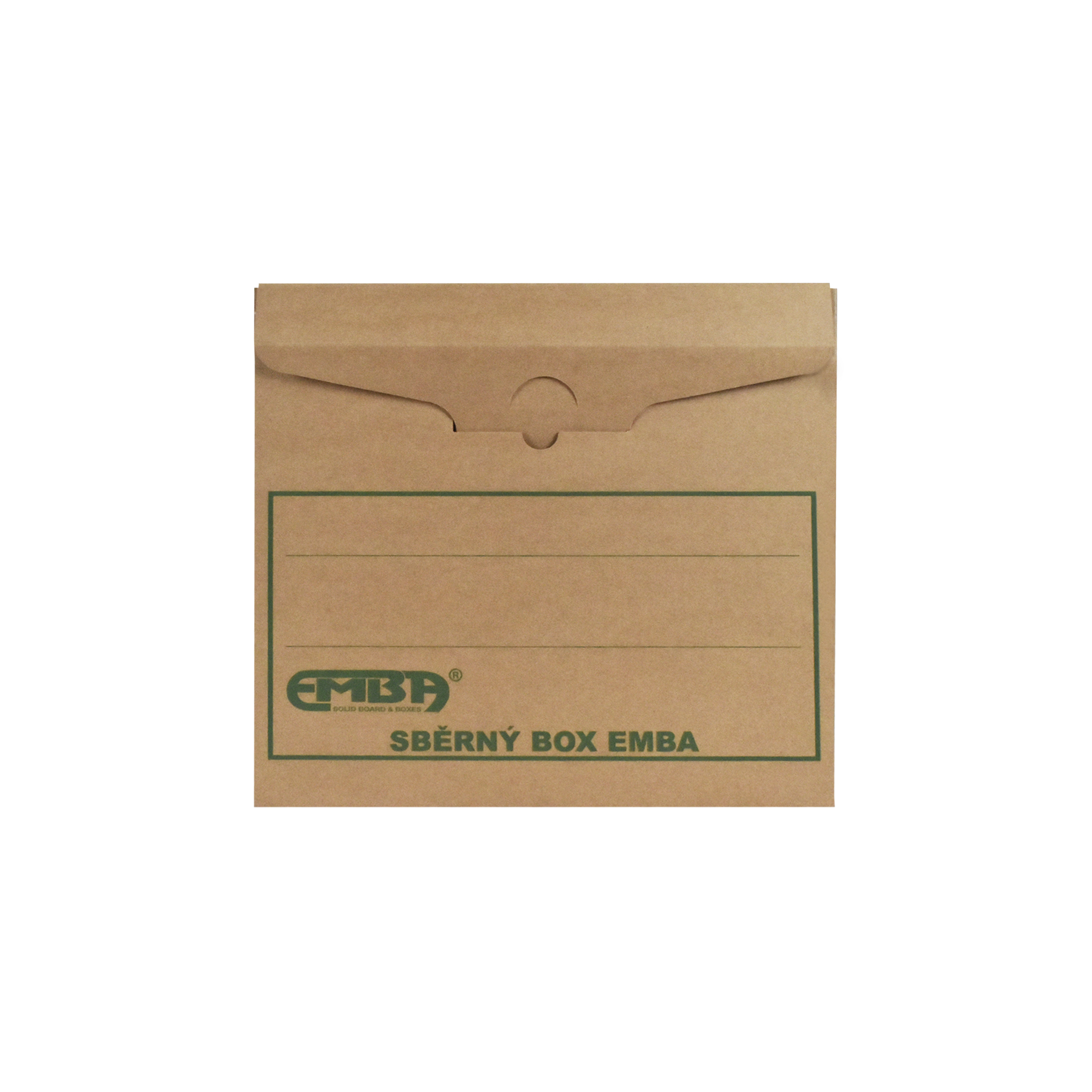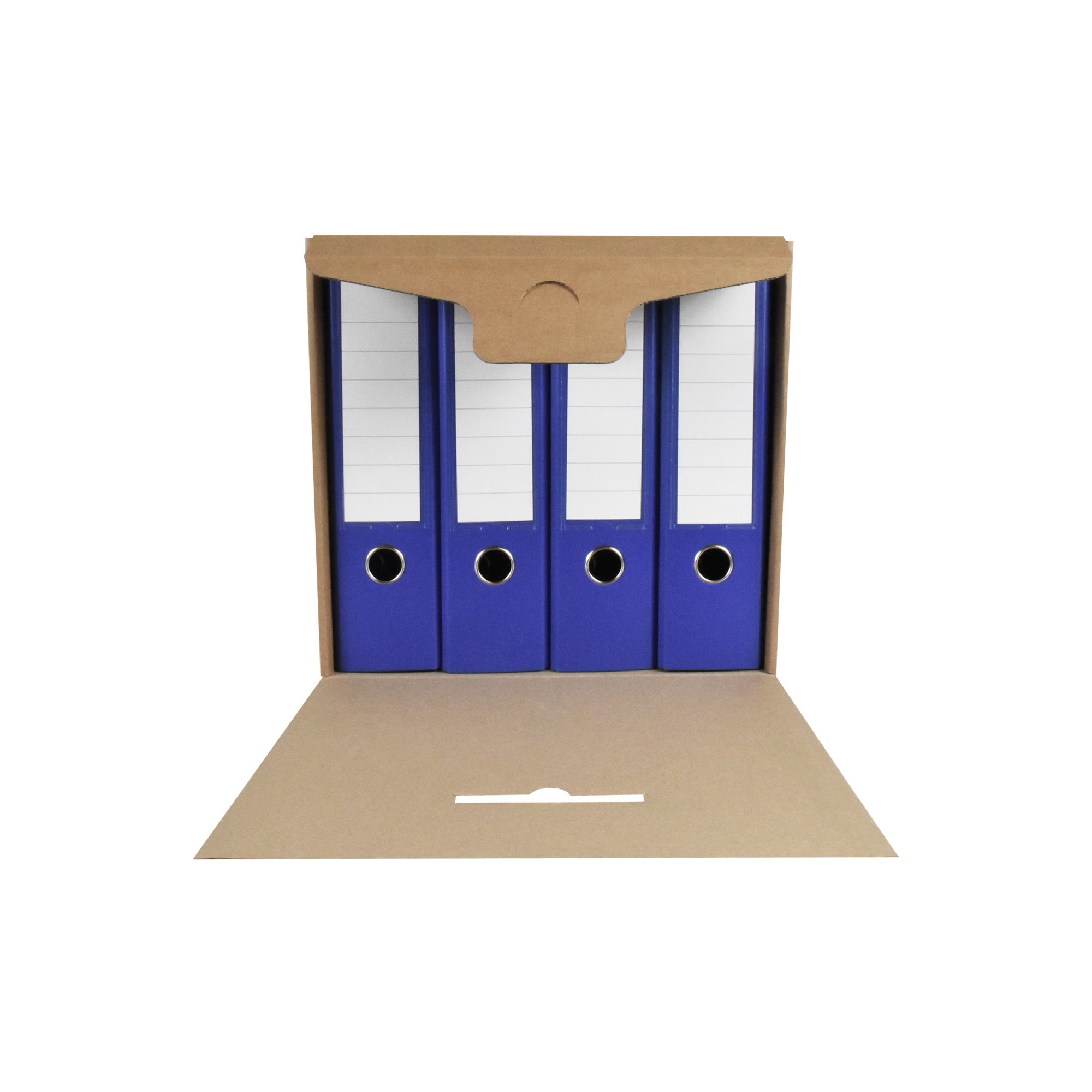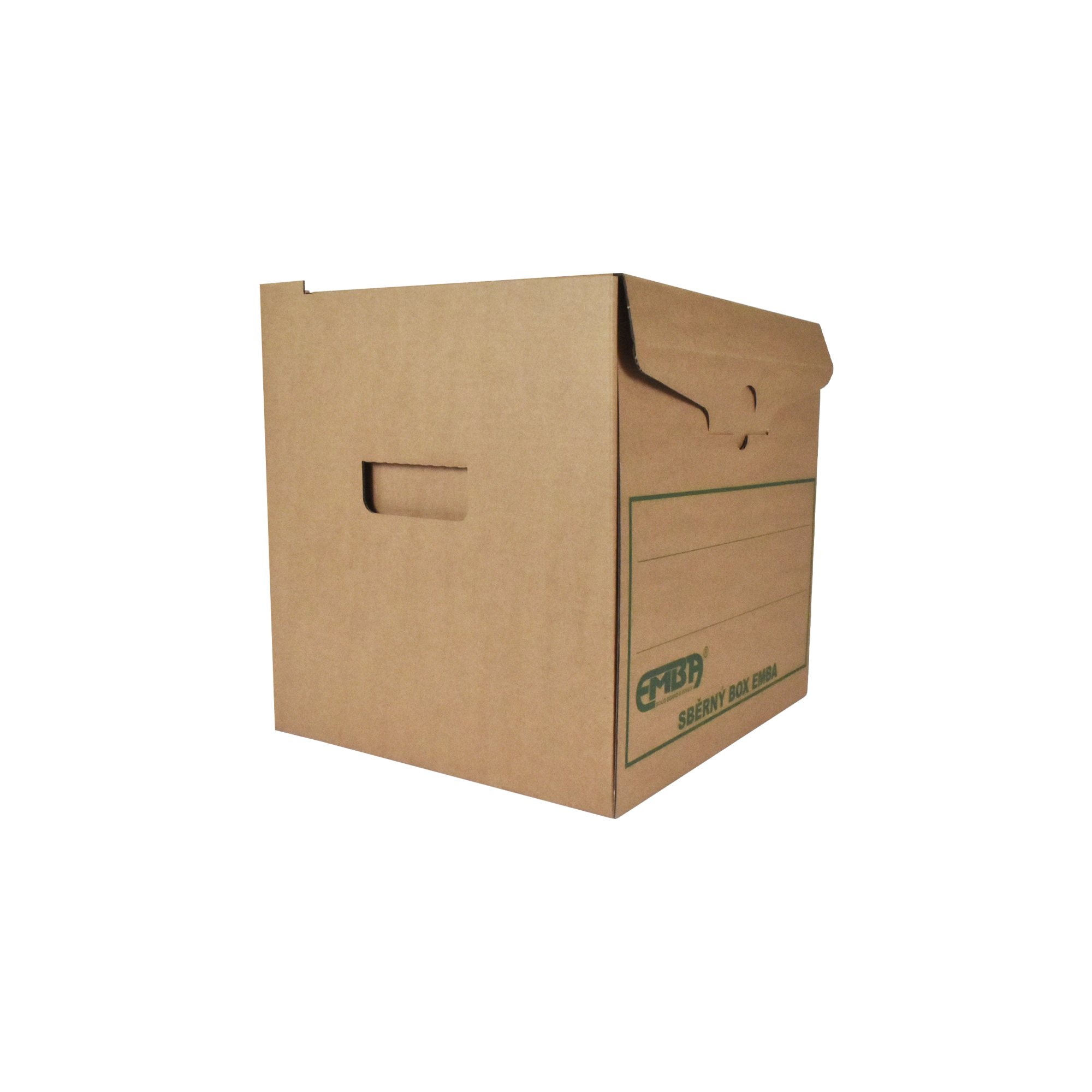 Box na uskladnenie 4 zakladačov so šírkou chrbta 7,5 – 8 cm. Vyrobený z kvalitnej trojvrstvovej vlnitej lepenky H/ H so zelenou potlačou. Konštrukcia boxu je spevnená zosilnením bočných stien. Umožňuje uloženie 4 skupinových boxov na seba, čím nahrádza kovový regál na miestach, kde ho z priestorového hľadiska nie je vhodné umiestniť.