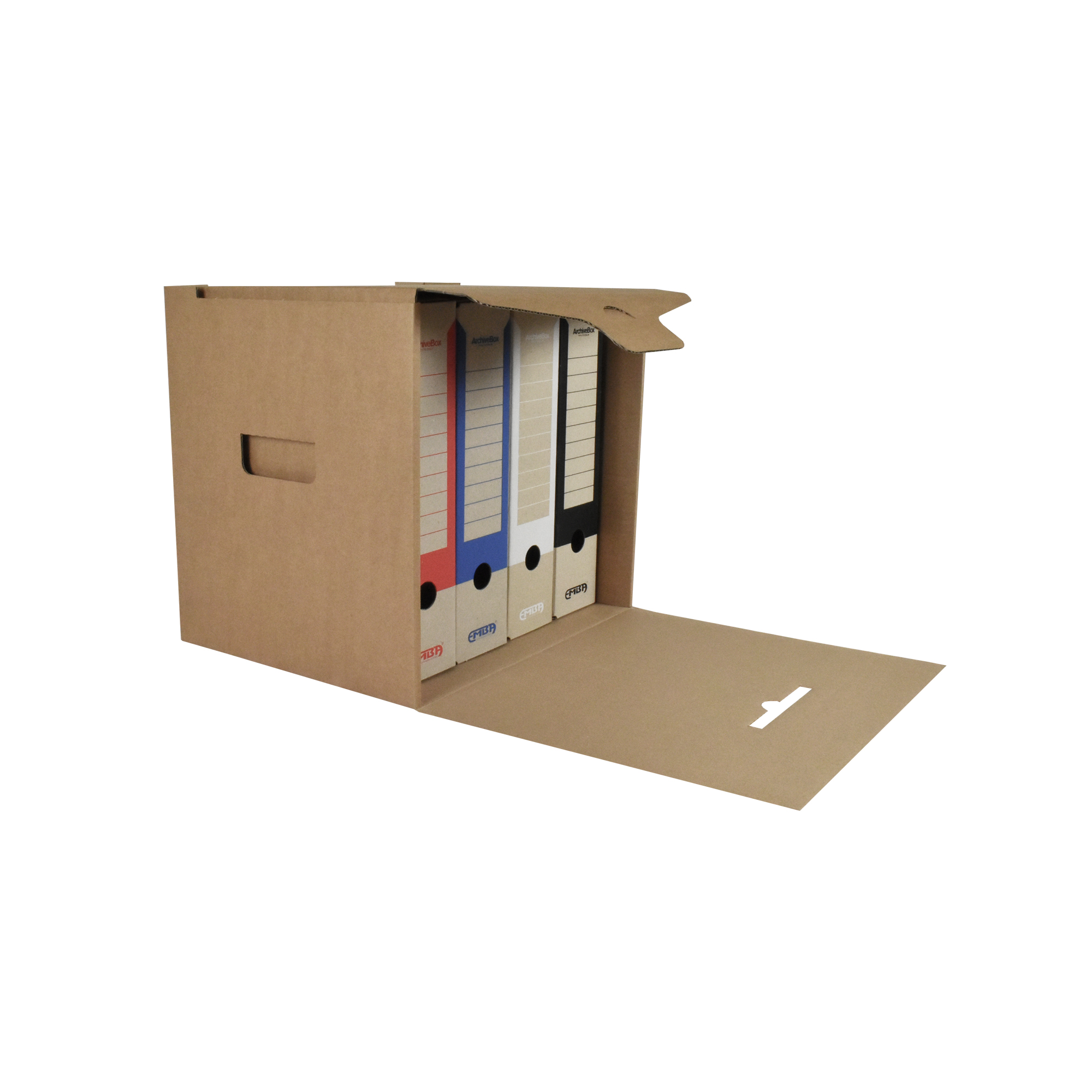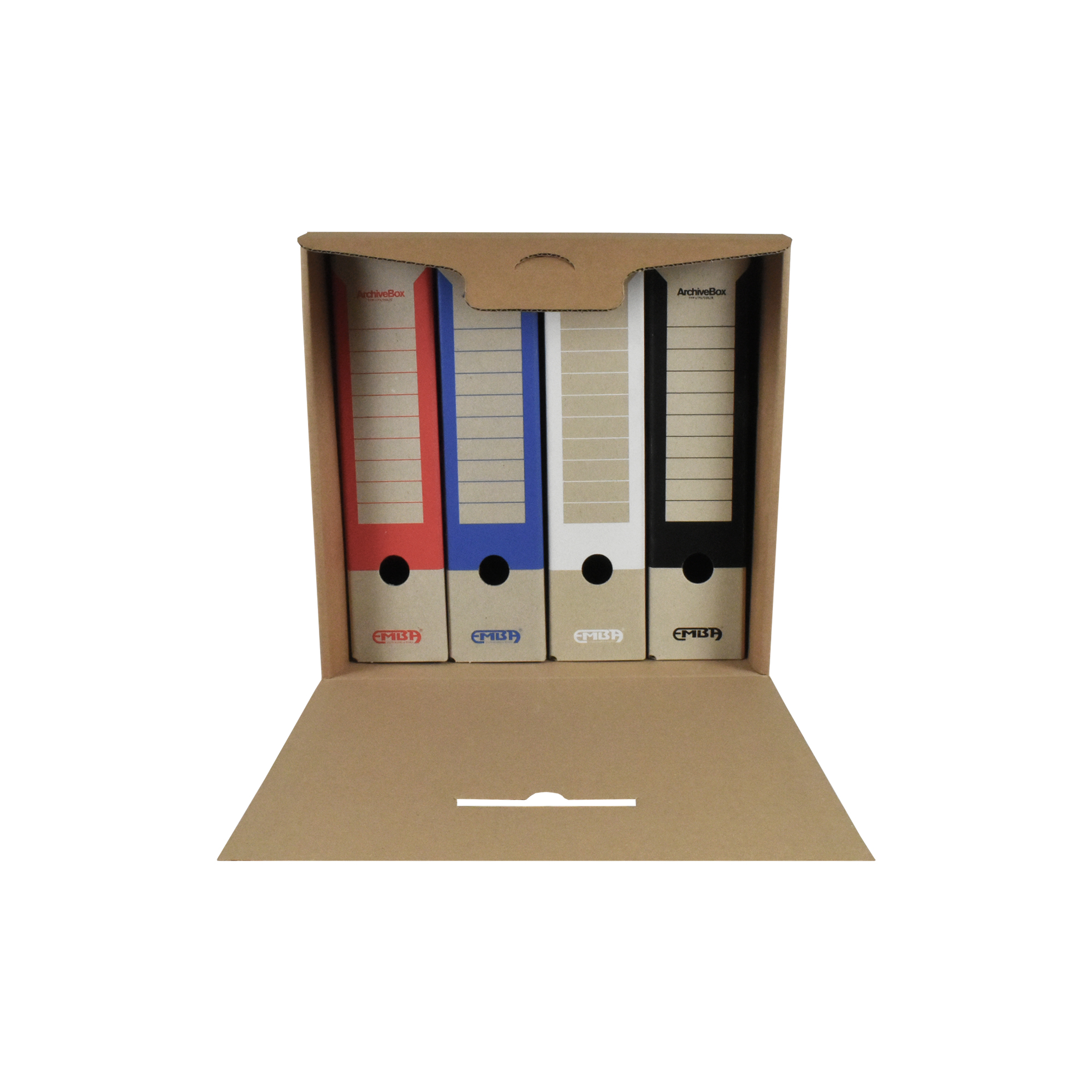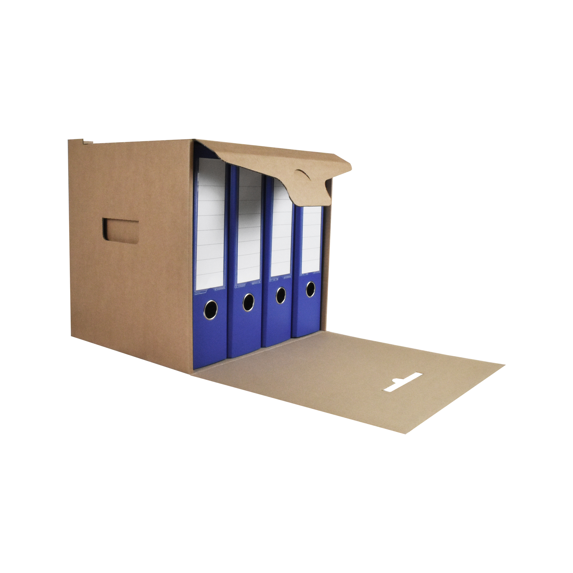 Box na uskladnenie 4 zakladačov so šírkou chrbta 7,5 – 8 cm. Vyrobený z kvalitnej trojvrstvovej vlnitej lepenky H/ H so zelenou potlačou. Konštrukcia boxu je spevnená zosilnením bočných stien. Umožňuje uloženie 4 skupinových boxov na seba, čím nahrádza kovový regál na miestach, kde ho z priestorového hľadiska nie je vhodné umiestniť.