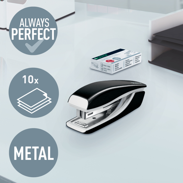Malá zošívačka v moderných žiarivých farbách ideálna nielen do kancelárie, ale aj domov alebo na cesty. Vždy perfektné zošitie vďaka patentovanej technológii DIT. V kombinácii so spinkami Leitz Power Performance P2 (č. 10) dosiahnete vždy jednoduché a správne zošitie.Kapacita 10 hárkov. Vrecková zošívačka. Patentovaná technológia DIT na spoľahlivé zošívanie. Balenie v škatuľke, vrátane spiniek. Otvorením ramena o 180° je možné použiť nástenkové zošívanie (takrovanie). Farba čierna.